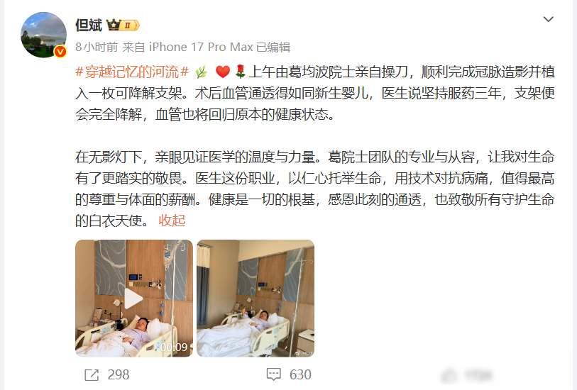 但斌发文:顺利完成冠脉造影并植入一枚可降解支架。 但斌最近体检,医生让他多做