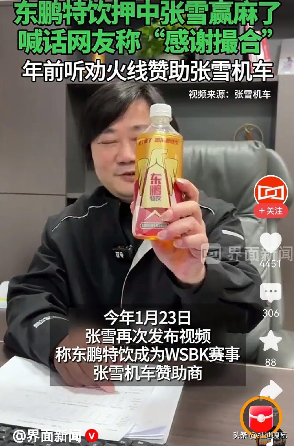 东鹏特饮赚翻了! 东鹏特饮也算是捡了个漏,去年11月张雪机车在招募赞助时,网友们建议找东鹏特饮,并在东鹏特饮官媒下留言,称要把握住这个机会。 2026年1月,东鹏特饮和张雪机车联手出征世界赛事,直到这次张雪机车连夺两个分赛冠军,也让东鹏特饮站到了世界冠军的舞台上。 可以说,东鹏特饮这次以小博大,仅几万的赞助就换来巨大的曝光量,真是彻底赚翻了!