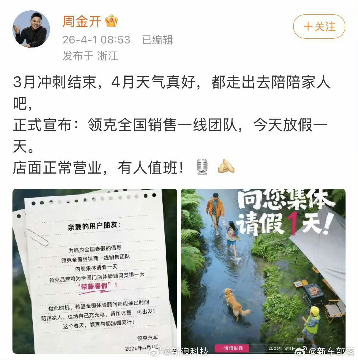 多家车企宣布给员工放春假我真的会狠狠羡慕!! 奇瑞直接放春假连休4天就算了,领克也紧跟着宣布全国销售带薪放1天春假,让大家忙完三月好好陪家人踏春。现在车企都开始这么卷福利了吗?!又是带薪假又是春光踏青,也太懂打工人了吧!这波操作直接拉满好感,又是实名羡慕,希望这股春假风赶紧刮到更多公司