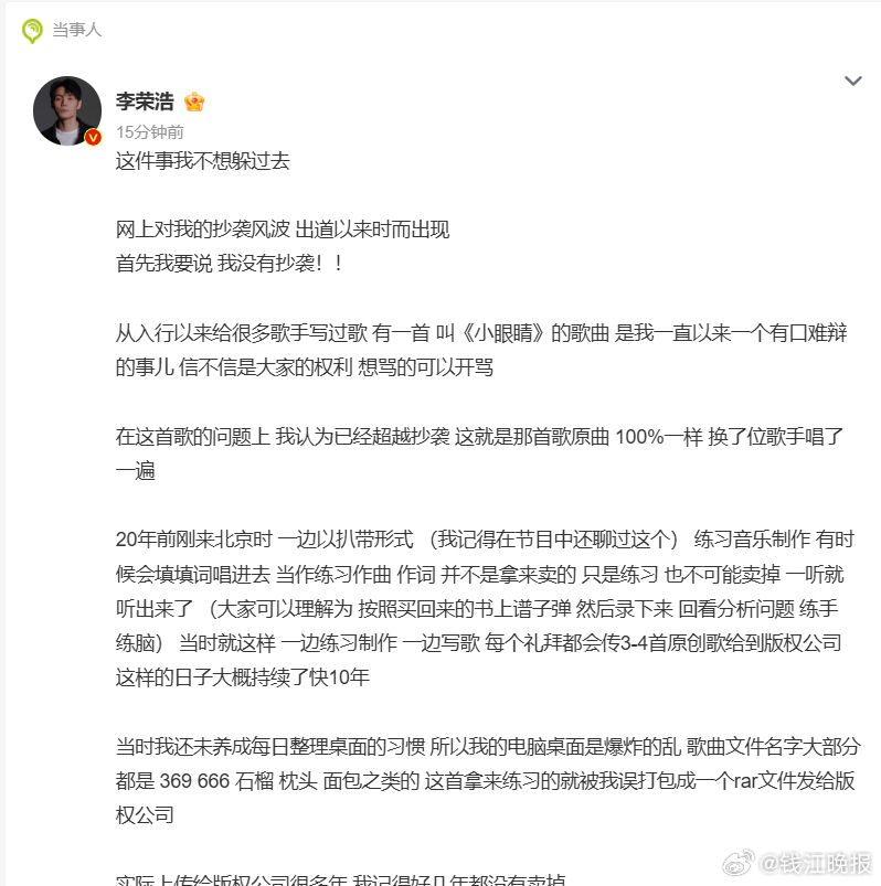 #李荣浩 抄袭# 【 #李荣浩否认抄袭#】 最近网友指出,李荣浩作曲《小眼睛》疑似抄袭平井坚《Signal》。刚刚,发长文回应: