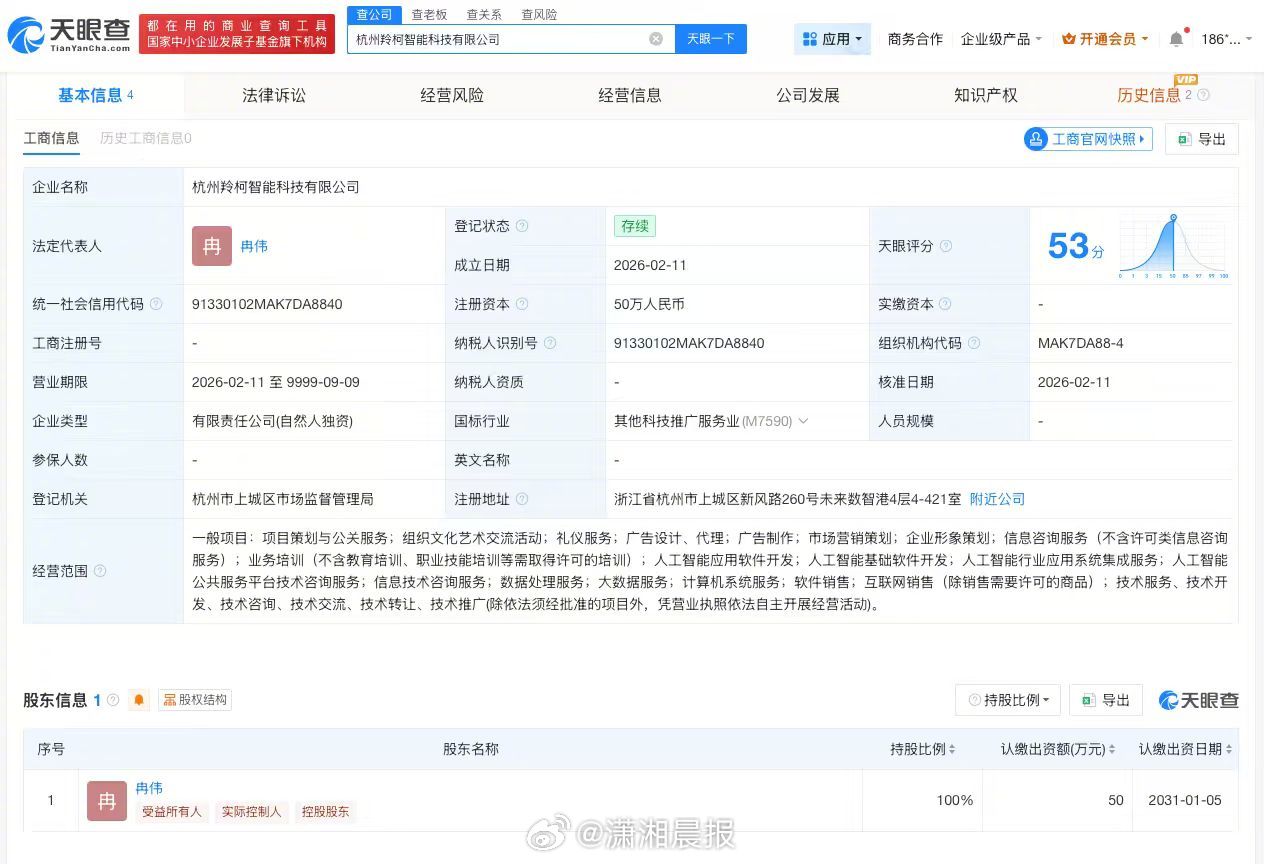 【#多家一人公司成立于近期##靠AI年营收150万一人公司揭秘#】#男子靠AI开一人公司年营收达150万# 据媒体报道,近日,浙江省首个区级OPC(一人公司)专项政策引发热议。天眼查App显示,受访者相关公司杭州羚柯智能科技有限公司成立于2026年2月,法定代表人为冉伟,注册资本50万人民币,经营范围包括人工智能应用软件开发、人工智能基础软件开发、市场营销策划等,由冉伟全资持股。另一受访者关联公司杭州星境引擎科技有限公司成立于2026年1月,法定代表人为彭镜臣,注册资本10万人民币,经营范围包括人工智能公共数据平台、人工智能应用软件开发、虚拟现实设备制造等。股东信息显示,该公司由彭镜臣、北京天娇星辰文化传媒有限公司共同持股。