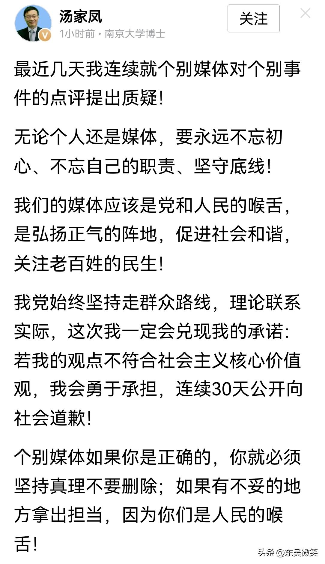 汤家凤教授再次单挑“个别媒体”! 汤教授说,如果自己的观点不符合社会主义核心价值观,自己一言九鼎,连续道歉30天。 唐教授说,如果“个别媒体”自认为没有错,就应当坚持自己的真理不要删评论,如果认为不妥就要勇于承认错误。 你们支持谁呢?