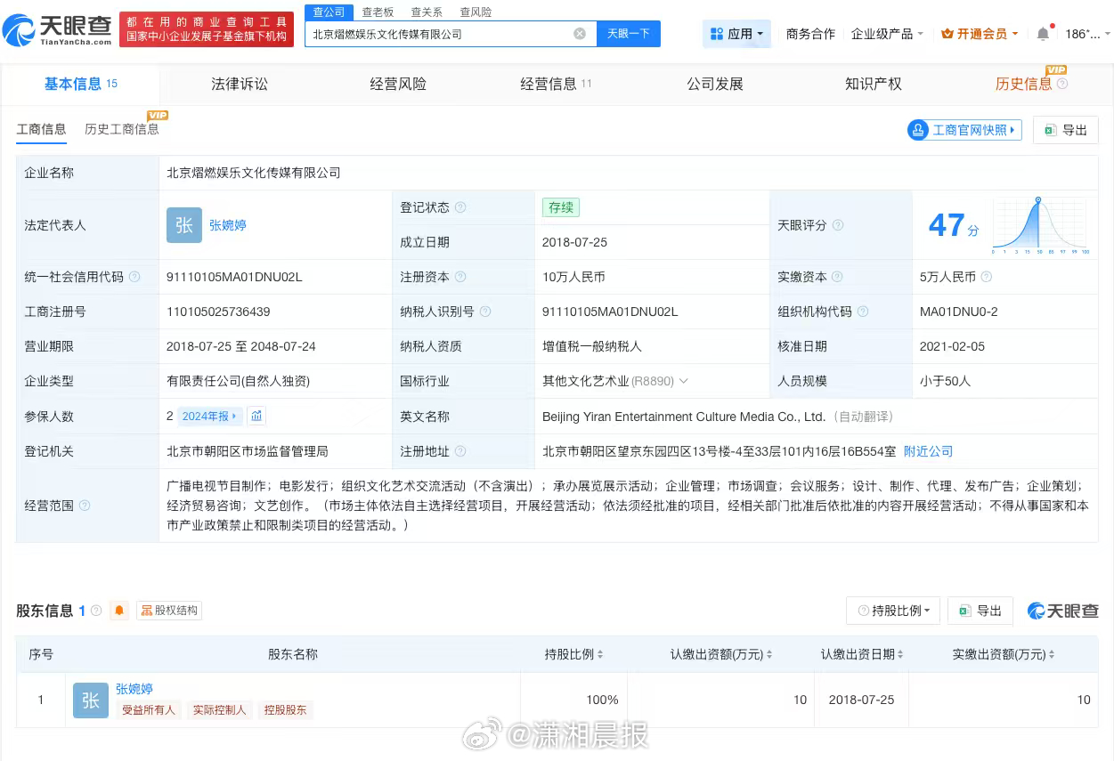 #宋宁峰张婉婷无商业关联#【#张婉婷宋宁峰关联公司揭秘# 】 近日,演员发长文回应出轨。天眼查App显示,张婉婷关联北京熠燃娱乐文化传媒有限公司成立于2018年7月,法定代表人为张婉婷,注册资本10万人民币,经营范围包括广播电视节目制作、电影发行、组织文化艺术交流活动等。股东信息显示,该公司由张婉婷全资持股。#宋宁峰 我也不出轨还要我怎样#