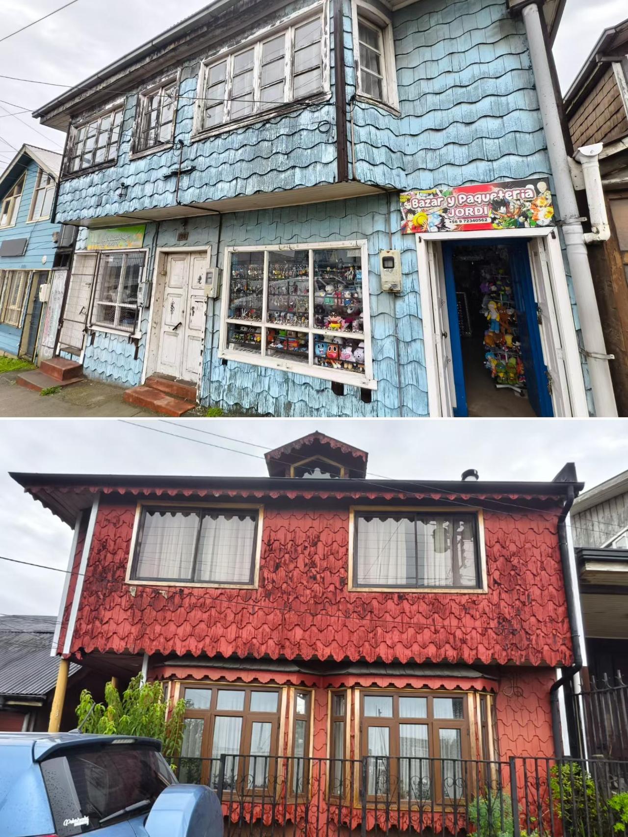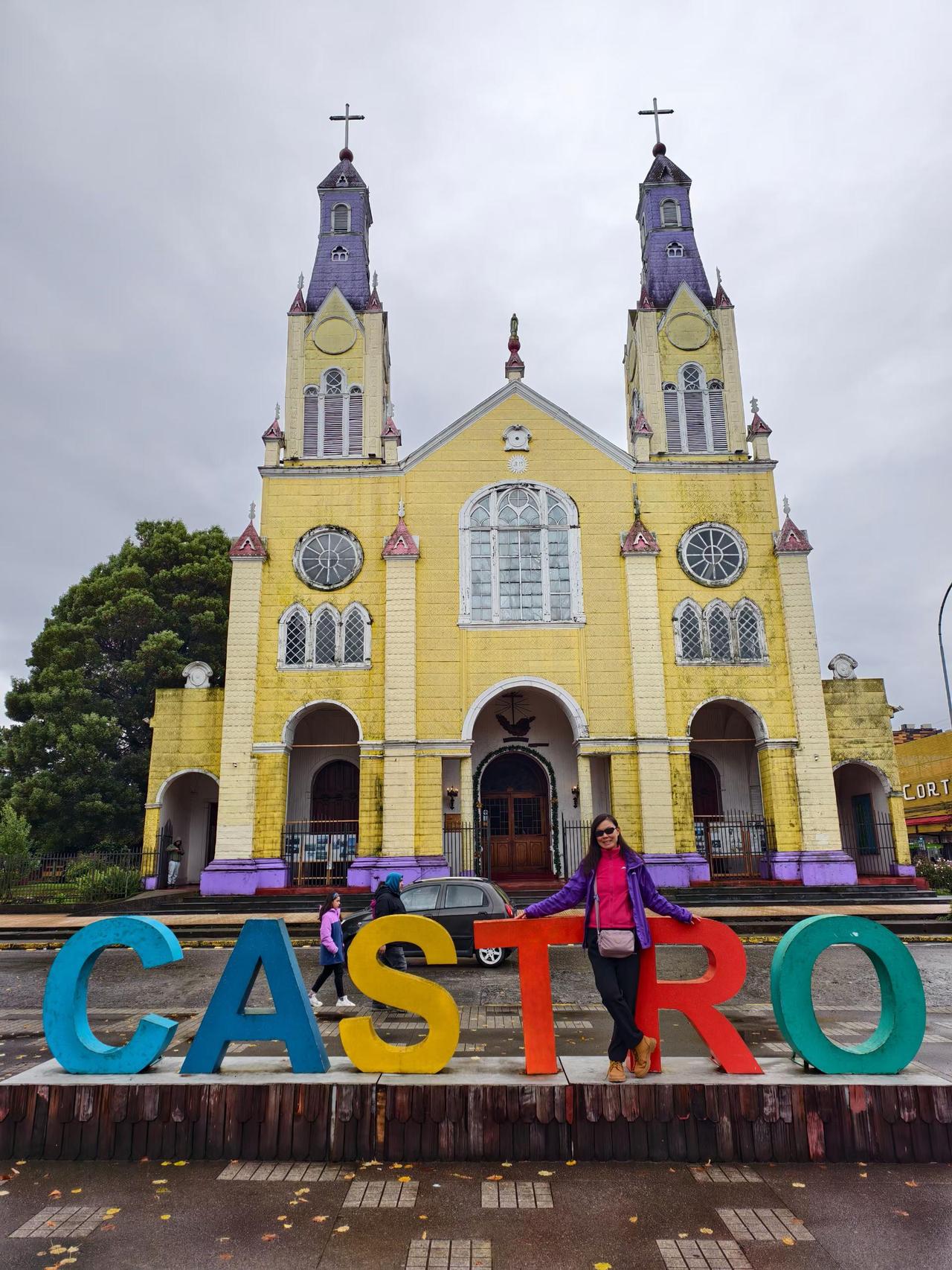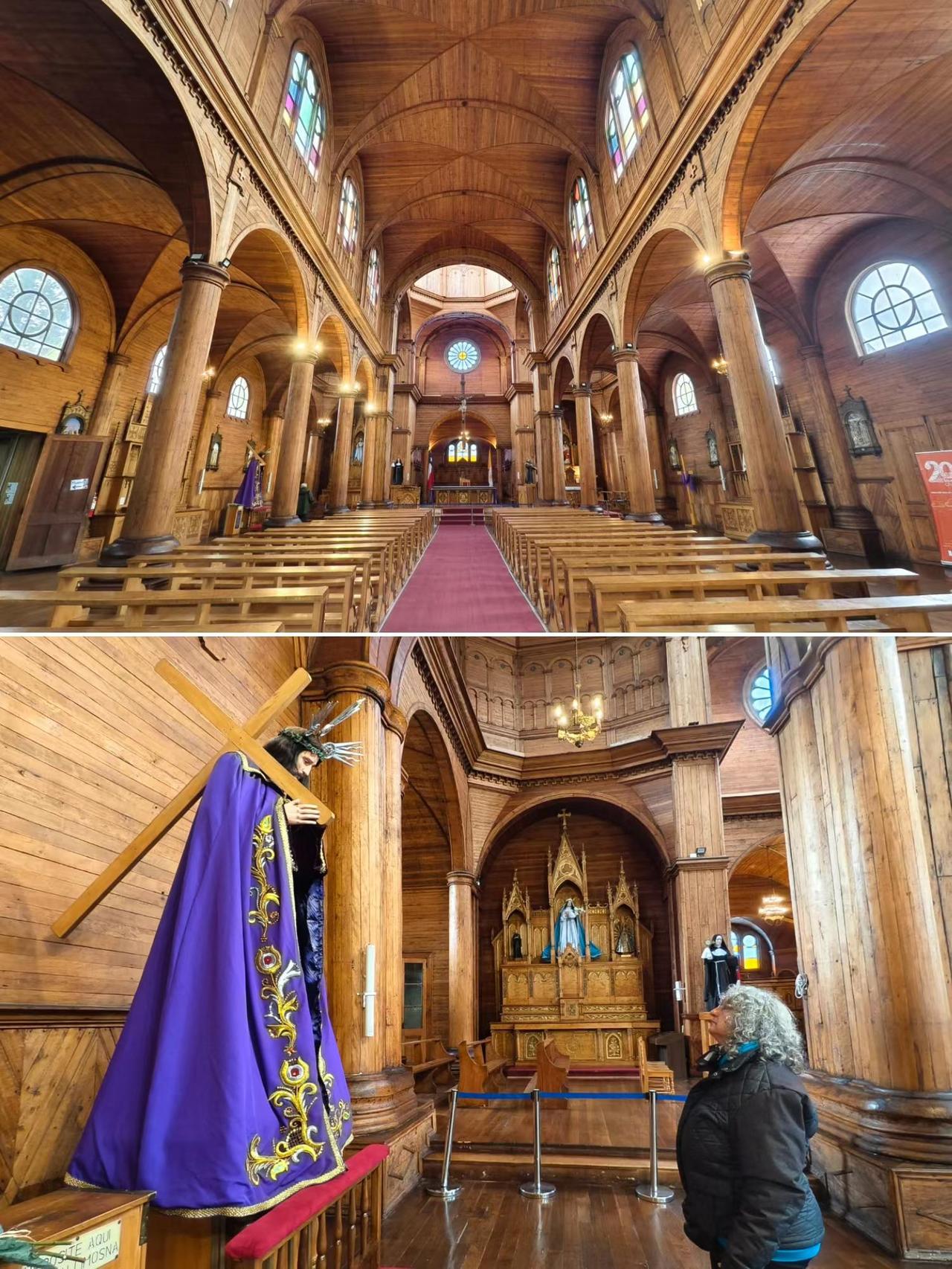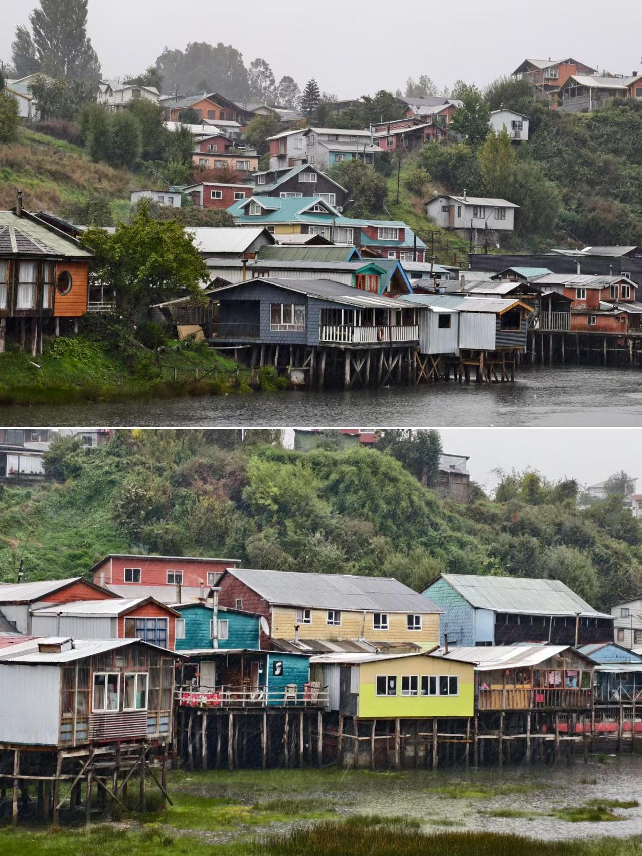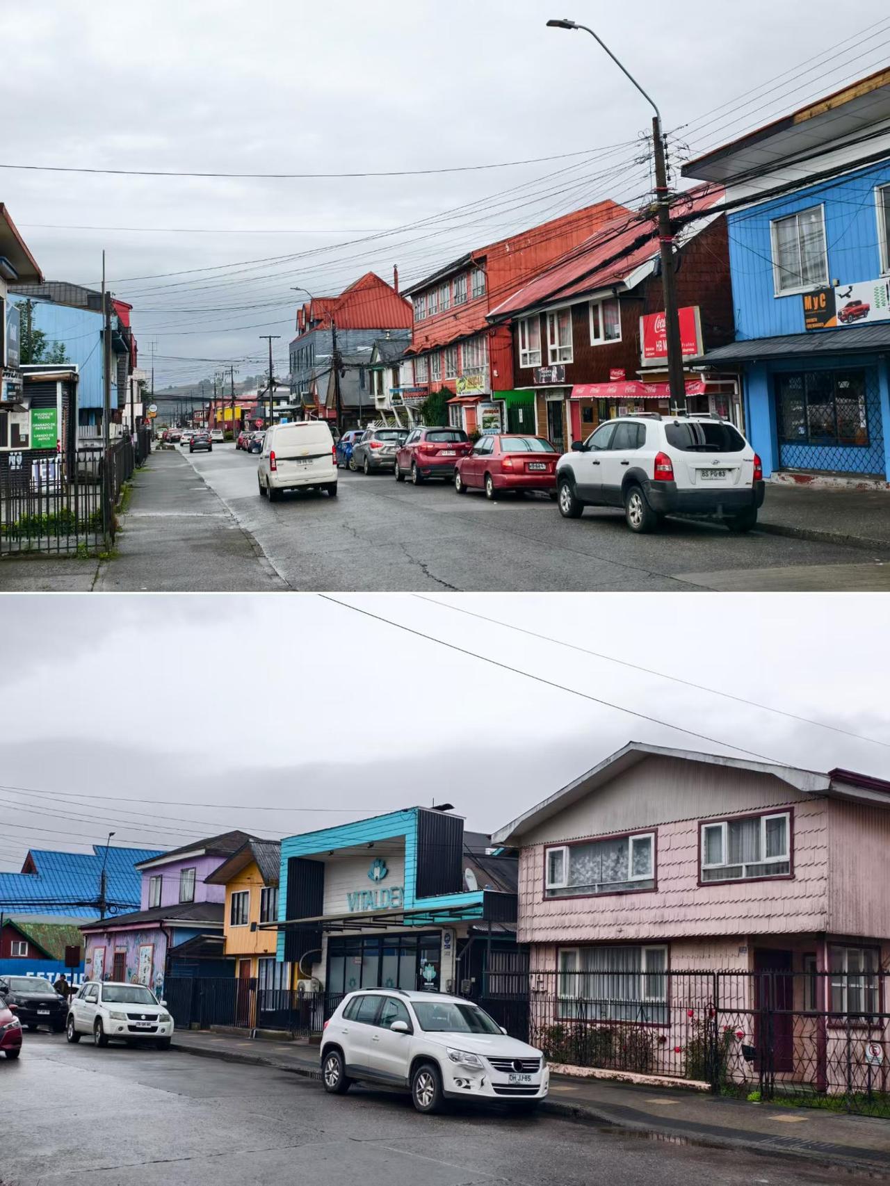 车行+载车渡轮三个半小时上到智利第二大岛——奇洛埃岛,许是下雨的缘故,岛上格外清静。16座世遗木质教堂,将欧洲风情与当地特色的“鱼鳞片建筑”相融,形成了独一份的混血建筑美学。 “鱼鳞片”外形除了样子独特,更是为适应当地多雨的气候,不过昨天在拉巴斯港其实也有看到。 首府卡斯特罗建在水上的彩色高跷屋只有很小一片,远没有湘西的吊脚楼好看。 所以我们继续开启吃吃吃!岛上的传统地坑海鲜炖菜是手掌大的海虹和鸡肉、肘子、土豆一起煮,两人都吃不完,居然才不到人民币90元,满满一碗新鲜海胆也不到40元,雨天大老远的算是没白来[偷笑]