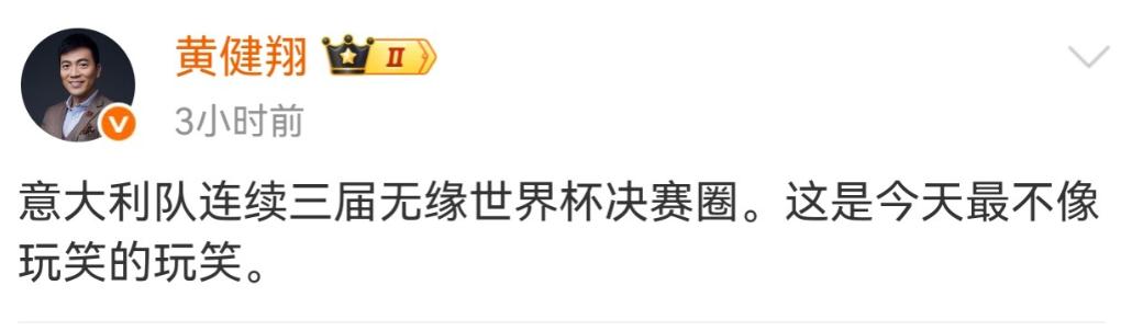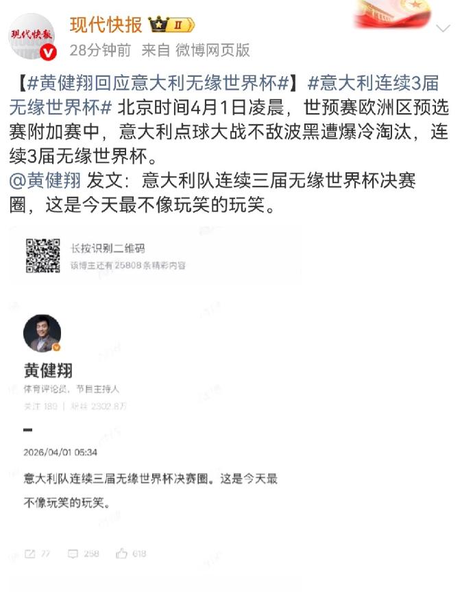 黄健翔,遗憾发文! 4月1日清晨05:43,体育评论员黄健翔,突然在社交平台发文,字里行间都是遗憾和无奈:“意大利队连续三届无缘世界杯决赛圈,这是今天最不像玩笑的玩笑。”短短一句话,道尽了无数球迷对这支传统豪门的惋惜与心酸。 4月1日的凌晨,当大多数人还沉浸在睡梦中,欧洲足坛一场关乎梦想的较量,正以最残酷的方式画上句号。 意大利与波黑的世界杯欧洲区附加赛,承载着无数蓝衣球迷的期待,却最终成为一场令人难以释怀的悲情战役。 没有人会预料到,这支曾四次站上世界之巅的豪门球队,会在这样一个特殊的日子里,再次与世界杯决赛圈失之交臂。 比赛的开局本是充满希望的。 基恩如同往日里那些意大利传奇前锋一样,用一次精准的把握机会能力,抓住对方门将的疏忽,一脚破门为球队打开局面。 那一刻,所有支持意大利的球迷,都仿佛看到了转机,看到了这支落寞豪门重返世界杯的可能。 毕竟,无论如何,四星意大利的底蕴,总让人愿意相信他们能顶住压力,拿下这场关键对决。 可足球从来不会因为底蕴而偏袒任何一方。 巴斯托尼的红牌,成为了整场比赛的转折点,也成为了压垮意大利队的第一根稻草。 少一人作战的困境,让原本就不算稳固的后防线彻底暴露在对手的进攻之下,波黑队的持续施压,终于在第79分钟收获成效,比分被扳平的那一刻,赛场内外的空气都仿佛凝固了。 加时赛的每一分钟,都像是在煎熬。 双方球员都拼到了体能极限,却始终没能打破僵局,点球大战成为了这场较量的终极判官。 遗憾的是,意大利队的球员们在这一刻失去了往日的沉稳,埃斯波西托的点球偏离球门,克里斯坦特的射门击中横梁,每一次失误,都像是在无数球迷的心上扎了一针。 1比4的点球比分,不仅是一场失利,更是一份耻辱——连续三届无缘世界杯,这是意大利足球史上从未有过的尴尬。 很难想象,曾经让整个足坛敬畏的蓝衣军团,会走到如今这一步。 还记得2006年,他们捧起大力神杯的模样,布冯的神扑、卡纳瓦罗的稳健、皮尔洛的掌控,那些身影构成了无数球迷的青春记忆。 那时的意大利,防守反击打得风生水起,是世界杯赛场上最具竞争力的球队之一,黄健翔当年那声激情呐喊,至今还能让人感受到那份属于蓝衣军团的热血与荣光。 意大利的衰落,从来都不是偶然。 曾经被誉为“小世界杯”的意甲联赛,如今早已没了往日的风采,为了控制成本,各俱乐部纷纷缩减青训投入,年轻球员没有足够的成长空间,青训断层成为了球队发展的最大阻碍。 与此同时,球队的战术思路停滞不前,固守着老旧的阵型,跟不上现代足球快速攻防的节奏,既丢了自己的防守优势,又没能形成有效的进攻体系。 教练的频繁更迭,更是让意大利队雪上加霜。 十年九任主帅,每一次换帅都意味着战术的重新调整,球员们刚适应一种打法,又要面临新的要求,这样的动荡,让球队始终无法形成稳定的化学反应。 反观同样经历过低谷的西班牙和德国,他们能及时调整方向,狠抓青训和体系改革,最终重新崛起,而意大利却一直活在2006年的荣光里,缺乏改变的勇气,一步步陷入深渊。 从2018年不敌瑞典,到2022年被北马其顿绝杀,再到如今败给波黑,八年时间,意大利队三次倒在世界杯附加赛的门槛上。 从2014年巴西世界杯之后,整整十二年,他们再也没有踏上过世界杯的赛场,曾经的豪门,如今只能沦为世界杯的看客,这样的落差,让人唏嘘不已。 愚人节本该是充满欢声笑语的日子,可对于意大利球迷来说,这一天却只有无尽的苦涩,黄健翔的这句感慨,说出了每一个热爱蓝衣军团的人的心声。 很多老球迷看了二十多年球,意大利队早已成为他们生活的一部分。 他们见证过球队的高光,也一次次在失望中坚守,如今看到球队一步步沦落,心中满是无力。 他们担心,或许这辈子,都再也看不到意大利队重新站上世界杯赛场的样子,担心那些曾经的传奇,只能成为回忆里的片段。 赛场上,意大利球员们失落的身影,让人心疼。 他们不是不努力,也不是没有拼尽全力,只是长期积累的问题,让他们在关键时刻难以突破。 青训的断层、战术的僵化、管理的混乱,这些问题交织在一起,让意大利足球陷入了难以挣脱的低谷。 想要走出低谷,意大利足球必须彻底醒悟。 放下过往的荣光,正视自身的不足,从青训抓起,改革战术体系,稳定教练团队,一点点积累力量。 或许这个过程会很漫长,或许会经历更多的失败,但只有这样,才能让这支曾经的传奇球队,重新绽放光芒,才能让无数球迷,重新燃起对蓝衣军团的希望。 如果各位看官老爷们已经选择阅读了此文,麻烦您点一下关注,既方便您进行讨论和分享,又能给带来不一样的参与感,感谢各位看官老爷们的支持!
