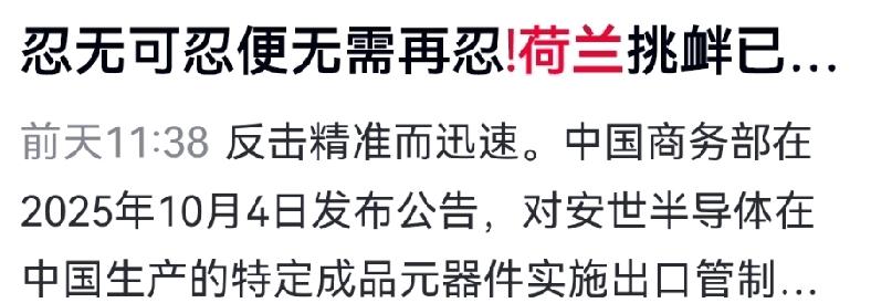 杀鸡儆猴!中国选定荷兰,一步棋看懂大国博弈深意! 忍无可忍,果断亮剑!中国此番瞄准荷兰出手,是经过精准考量的战略抉择,尽显大国格局与雷霆手段! 2026年3月11日,荷兰彻底倒向美国,单方面撕毁合作默契,突然加码半导体管制,直接封禁28/45纳米DUV光刻机,当日落地执行,直指我国民用芯片命脉,妄图卡死制造业发展咽喉。 为何不选美日,偏偏是荷兰?美日向来对华遏制,早已是明面对手,惩戒难起警示之效;而荷兰身为中立国,坐拥DUV全球垄断权,背靠中国庞大市场却背刺盟友,拿它开刀,就是给全球摇摆势力敲响警钟:背信弃义、甘当霸权马前卒,必付沉重代价! 中国早有后手,国产光刻机突破在即,同时精准反制荷兰优势产业,既守底线,更破霸权,大国底气尽显无遗! 对此,你怎么看? 大国博弈 中国半导体反制 荷兰光刻机 杀鸡儆猴