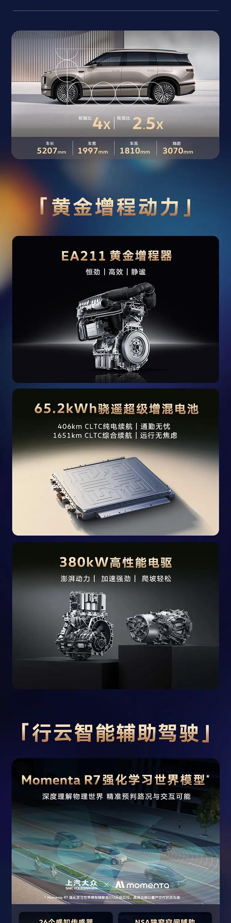 增程旗舰ID.ERA 9X,以硬核实力重构家庭出行新标杆 当新能源市场进入价值比拼的下半场,上汽大众首款增程旗舰ID.ERA 9X正式开启预售,以32.98万元起的诚意定价,为中国家庭带来了一台集德系品质、黄金增程、智能驾控于一体的全场景出行解决方案。 作为大众首款增程旗舰,ID.ERA 9X的核心竞争力,正是其「黄金增程动力」系统。EA211黄金增程器历经全球超2500万台装机验证,实现恒劲、高效、静谧三大核心优势,彻底解决增程车型“亏电肉、噪音大、油耗高”的痛点;搭配65.2kWh骁遥超级增混电池,带来406km CLTC纯电续航与1651km CLTC综合续航,日常通勤纯电出行无压力,长途自驾满油满电跨城无忧;380kW高性能电驱系统,输出澎湃动力,加速强劲、爬坡轻松,兼顾家用与驾驶乐趣。 智能层面,ID.ERA 9X搭载Momenta R7强化学习世界模型,深度理解物理世界,精准预判路况,搭配26个感知传感器与NSA狭窄空间辅助,覆盖城区、高速、泊车等全场景出行,让5.2米级大车也能好开好停。 车身尺寸5207×1997×1810mm,轴距3070mm,打造全尺寸六座大空间,实现“六座平权”,每一排都是C位。从黄金增程到智能驾控,从德系品质到亲民定价,ID.ERA 9X以越级产品力,重新定义30万级增程旗舰,成为中国家庭出行的全新标杆。