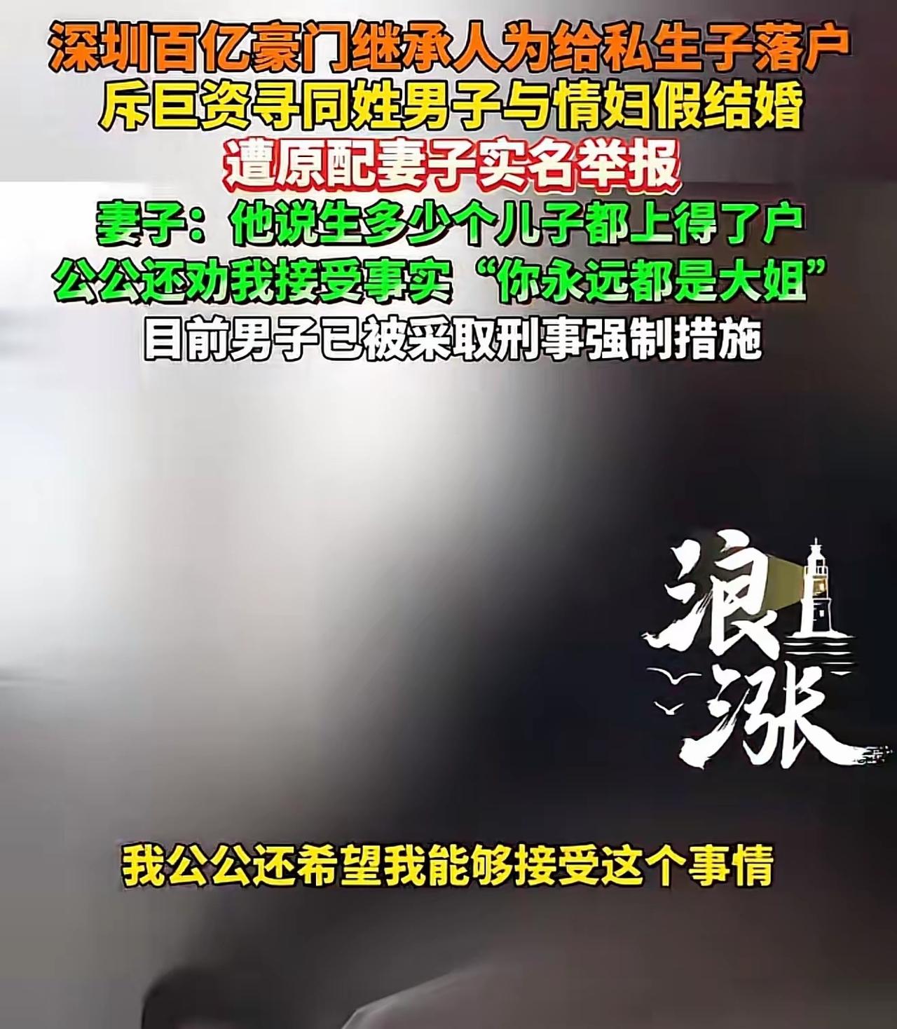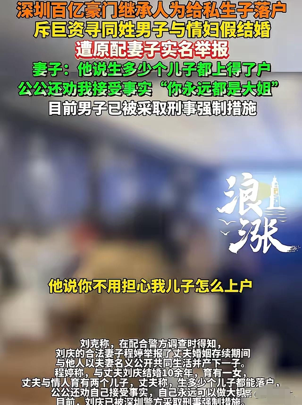 “原配威武!”广东深圳,女子嫁给了百亿豪门的儿子。谁知,对方背着她,竟在外面养情人,还生了两个儿子。 事情败露后,男方不但不思悔改还给私生子上户口。而接下来原配的操作,直接赢麻了! 有些人真的是不见棺材不落泪!说白了,也是有点自以为是,以为有钱就可以为所欲为,结果呢,只不过是搬起石头砸了自己的脚。 广东深圳,女子程某从19岁就跟着某地产大亨的儿子,从相恋结婚,一路风风雨雨走过来,也算是有过恩爱甜蜜的时刻,而且两人婚内育有一女,本该是个幸福美满的家庭。 然而,有句老话说的好,饱暖思淫欲。有钱人的公子哥从小锦衣玉食,做事都有父母家庭托底,自以为可以为所欲为。 所以,时间一长,可能是和妻子感情变淡了,也可能是纯粹为了追求新鲜刺激感。公子哥居然在外面金屋藏娇,还生了两个儿子!而且两人多次以公开身份出现在公众场合。俨然他们才是合情合法的恩爱夫妻。 原配程某知道后,自然是又委屈又愤怒。想到自己这些年为这个家掏心掏肺,又老人对孩子的付出都是问心无愧,最后呢,居然会遭遇背叛! 于是程某找到丈夫对质,希望丈夫能够改过自新,重新回归家庭。然而,丈夫的一番话和一番举动让她彻底寒了心。 因为,为了让自己的两个私生子顺利落户,公子哥居然花了30万元找了个同姓的男子与情人假结婚。 这个同姓男子欠了一屁股外债,特别缺钱,所以想到没多远就同意了。 而且,丈夫还嚣张的对程某说:我有多少儿子都能为他们落户! 听听这话,又豪橫又无法无天! 没办法,程某只好去找自己的公公,希望公公看在家族名族,孙女的份子上能劝一劝儿子。 可万万没想到,公公的态度让她更加绝望了。因为公公居然让她:睁只眼闭只眼,说她永远是大姐! 公公的言外之意就是:你好好的做你的豪门阔太,过锦衣玉食的日子,至于丈夫如何,不要管! 这算什么?!有钱人可以三妻四妾?! 程某见这一家人都如此三观不正,于是,一气之下,把丈夫告上了法庭。而且,当初那个假的男子也答应给程某作证,证明其丈夫犯有重婚罪。 最后,公子哥被警方采取刑事强制措施,取保候审,而参与假结婚的刘克也被警方依法传唤了。 接下来,等待他们的将是法律的严惩! 最后想说的是,原配威武!这件事真的太解气了!有钱真不能为所欲为! 我们要狠狠批判那种出轨、养小三、生私生子、还假结婚上户口的恶心行为,更看不起那些纵容儿子胡来、逼原配忍气吞声的豪门三观。婚姻不是有钱人的游戏,法律更不是摆设。 这件事也是想告诉大家:女人一定要有底线,受了委屈绝不要忍! 要敢闹、敢告、敢维权,这才是真骨气、真威风。 最后,也给所有人提个醒:别以为有钱有势就能乱来,出轨重婚不仅缺德,更是犯法。 不管你多有钱,触碰法律红线,照样要付出代价。守住良心,尊重婚姻,才是最踏实的路。 对此你们怎么看呢?