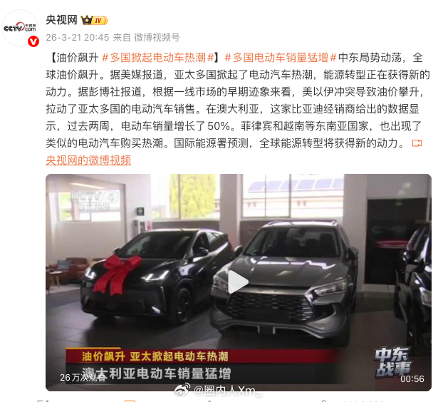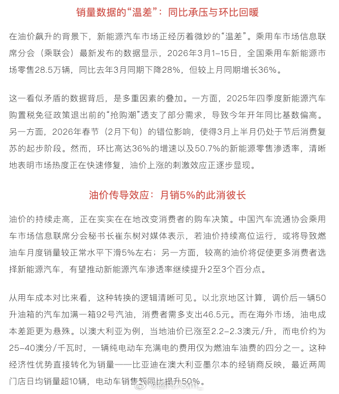 乘联会秘书长表示持续高油价将让燃油车月销下滑约5%,同时推动新能源车渗透率再提升2-3个百分点。全球新能源车需求大涨,比亚迪澳洲订单暴涨50%。这似乎是新能源取代燃油车的信号~~