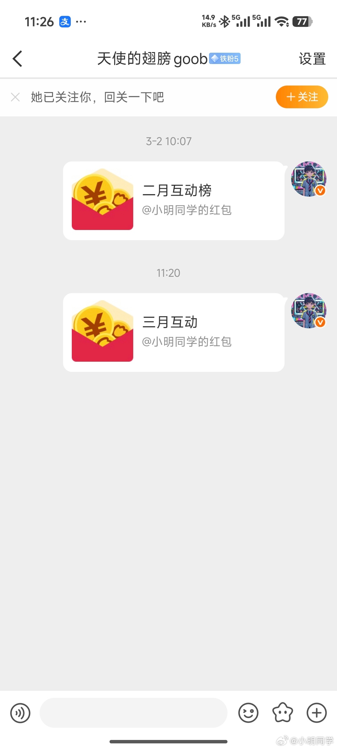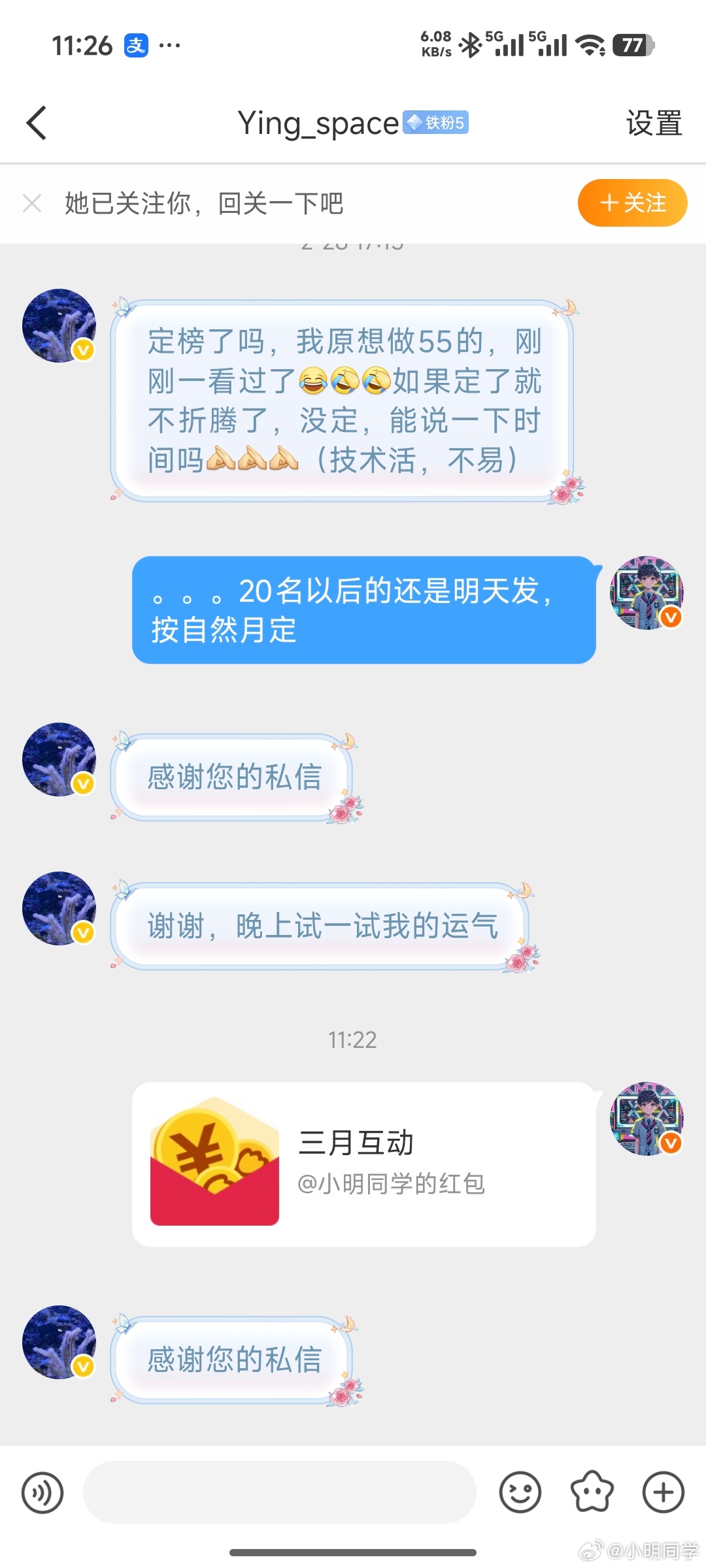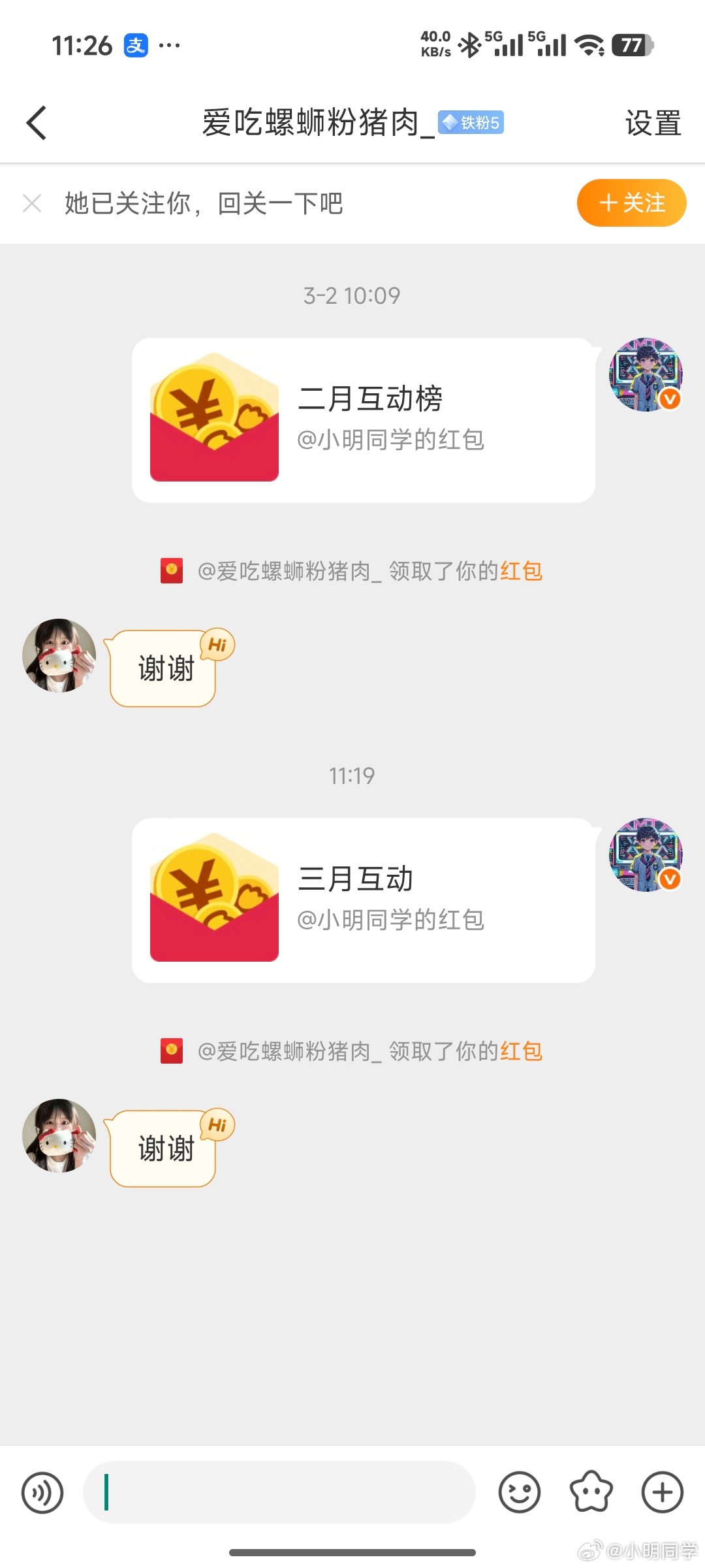 小明同学的红包 三月份互动榜排名22 33 44 55 66 77 88 99的老铁们,红包已经私信,注意查收