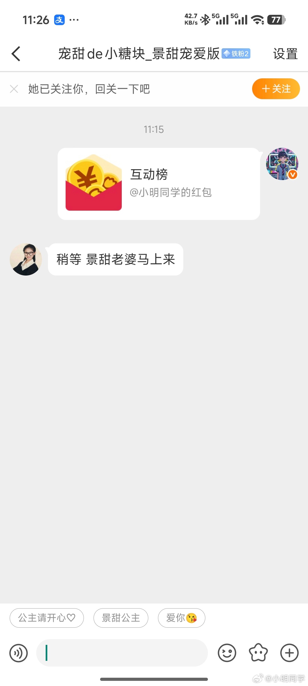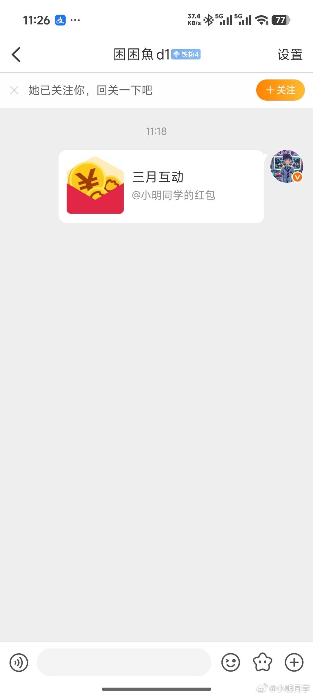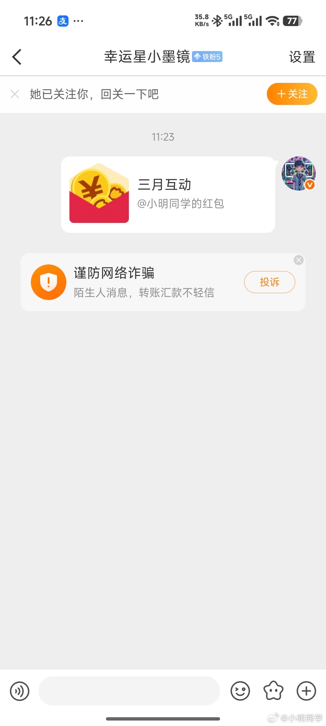 小明同学的红包 三月份互动榜排名22 33 44 55 66 77 88 99的老铁们,红包已经私信,注意查收