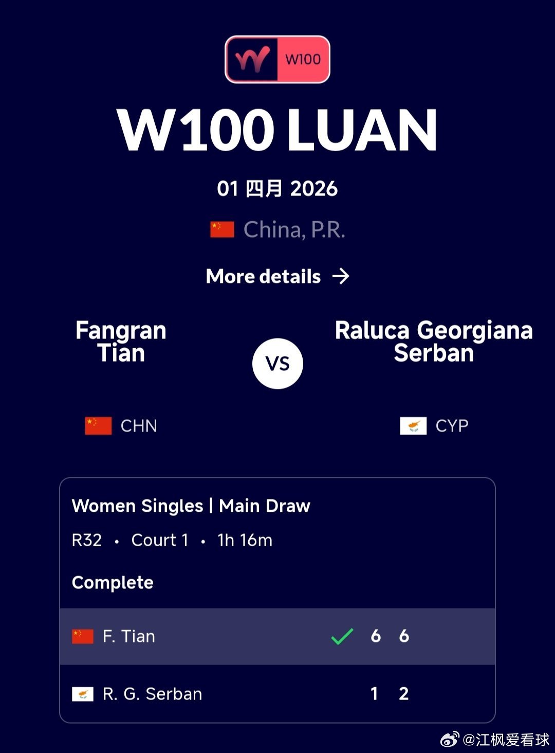 田方然🇨🇳6-1/6-2战胜谢尔班🇨🇾,晋级下一轮,恭喜田方然!🎉🎉🎉
