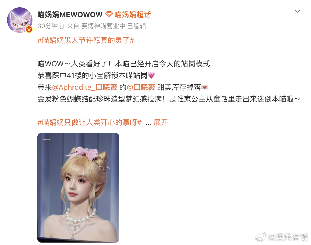 田曦薇千金猫这段完播率百分百理解张凌赫说田曦薇是小笼包了 喵娲娲太有品了!居然放的是千金猫田曦薇~金发蝴蝶猫咪造型,梦幻感爆棚,像从童话里走出来的小公主 小田软萌长相配灵动神态,网友热评:理解张凌赫为啥叫小田小笼包了,“外面白白的,里面甜甜的”,这段完播率百分百不意外
