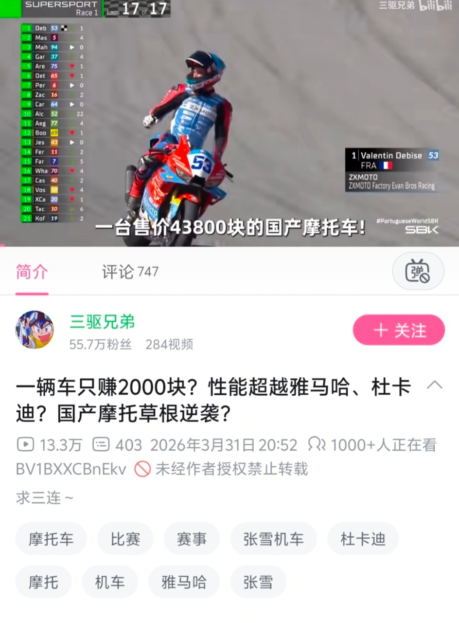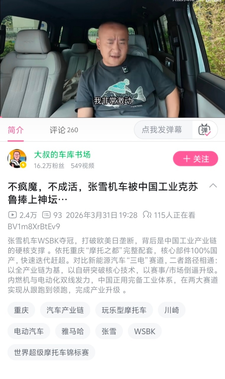 浙创投为张雪机车投资9000万 内燃机与电动化双线发力到底有多🐮,阿B up分析了张雪机车获得九千万投资的原因,内燃机与电动化双线发力且核心部件100%国产,张雪的这台车发动机的核心是自主研发的819cc 直列三缸发动机,阿婆主带你深入了解,为什么张雪机车可以领先雅马哈、杜卡迪将近4秒