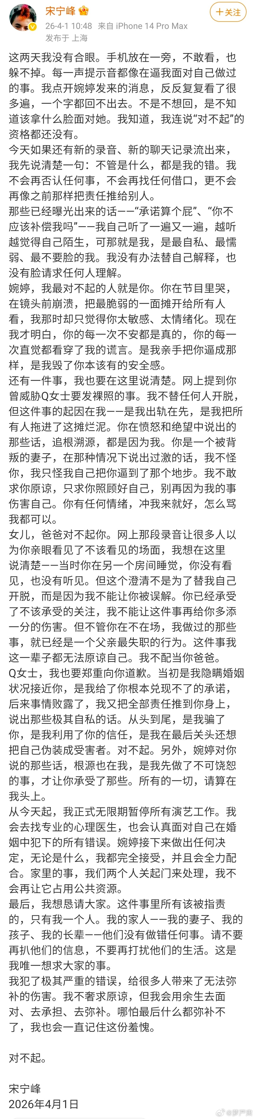 宋宁峰为出轨向张婉婷、Q女士、女儿道歉。并宣布退圈。