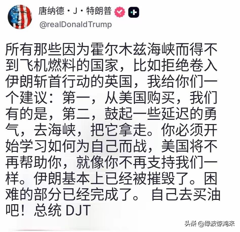 这是真被气着了![捂脸] 特朗普那些在大场面上不好说的话,全在社媒上倒出来了! 也难怪,他这回对伊朗动手,放眼望去,所谓盟国竟没一个跟着走的。这种光景,美国多少年没见过了。搁谁身上都没面子,何况是他这么要脸面的人! 可他也不想想,自己这些年都干了什么:一边喊着美国优先,对盟友下手比谁都狠,税率说加就加;一边打仗连个由头都拿不出,联合国那边招呼都不打一个。自己把路走绝了,还指着别人跟上来? 这回好了。喊了半天,没人应声。 这世道早变了。不是嗓门大就有人跟,不是拳头硬就有人服。你把人当傻子,人就让你当光杆司令! 要还是那副唯我独尊的派头,还是那种想打谁就打谁的做派,到头来,真就只剩自己跟自己玩了![笑哭]