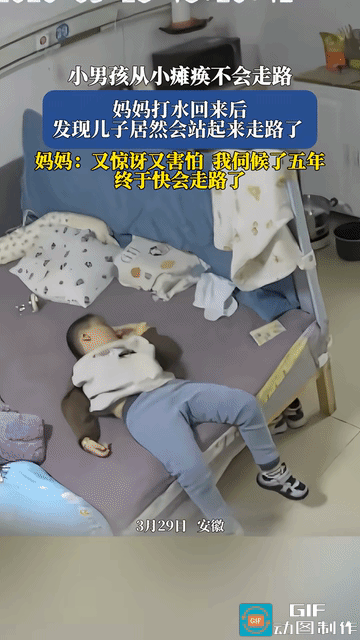 “天降奇迹!”安徽,5岁男孩从小瘫痪不会走路,妈妈去打水回来后,发现儿子居然站起来走饭桌边吃零食,妈妈看到后激动不已,眼泪一下子就下来了,称多年努力没有白费! 原来小男孩从生下来就被确诊为先天性基因病 ,存在讲话、行动和认知缺陷,但父母并没有放弃他,辗转各大医院为孩子治疗,但收效甚微,平时需通过康复课引导训练。 妈妈为了照顾孩子也没办法工作,就专心陪着儿子,还学习按摩手法,每天都给儿子按摩,防止儿子腿部肌肉萎缩,日复一日,年复一年,就这样妈妈照顾了儿子5年,她一直坚信儿子终有一天会站起来的。 这天妈妈把儿子放在床上自己去打水,可等他打水回来刚进屋,就看到站在桌子前儿子的背影,她当时直接愣在原地,也不敢出声,深怕这是自己的错觉,也怕吓到儿子。 她想走到儿子身边,发现腿都有点动不了了,眼泪如断了线的珠子滴在地上,埋在尘土里。妈妈平复一下心情,深呼吸几口,才慢慢上前! 妈妈立马带儿子去医院检查,但一切如常,医生也说不清楚为什么他突然就会走路了。 妈妈很开心,自己多年的努力终于没有白费,她希望儿子越来越好。 看到这一幕也为这位妈妈和儿子开心,其实很多事情真的解释不清楚,也许是机缘到了,他自然而然就发生了,妈妈也算苦尽甘来了。 但也有网友怀疑这是段子,如果是个瘫痪的孩子,不会双腿垂地,也不会穿着鞋,更不会迈开腿走路……,奇迹出现也得有个过程! 网友有怀疑可以理解,但我更相信这是真的,毕竟没有哪位妈妈会拿儿子不会走路来说事,妈妈应该没那么坏的心思! 不管怎样都为这个男孩开心,前5年受尽磨难,现在开始余生坦途,祝他越来越好! (视频来源网络,侵删[祈祷])
