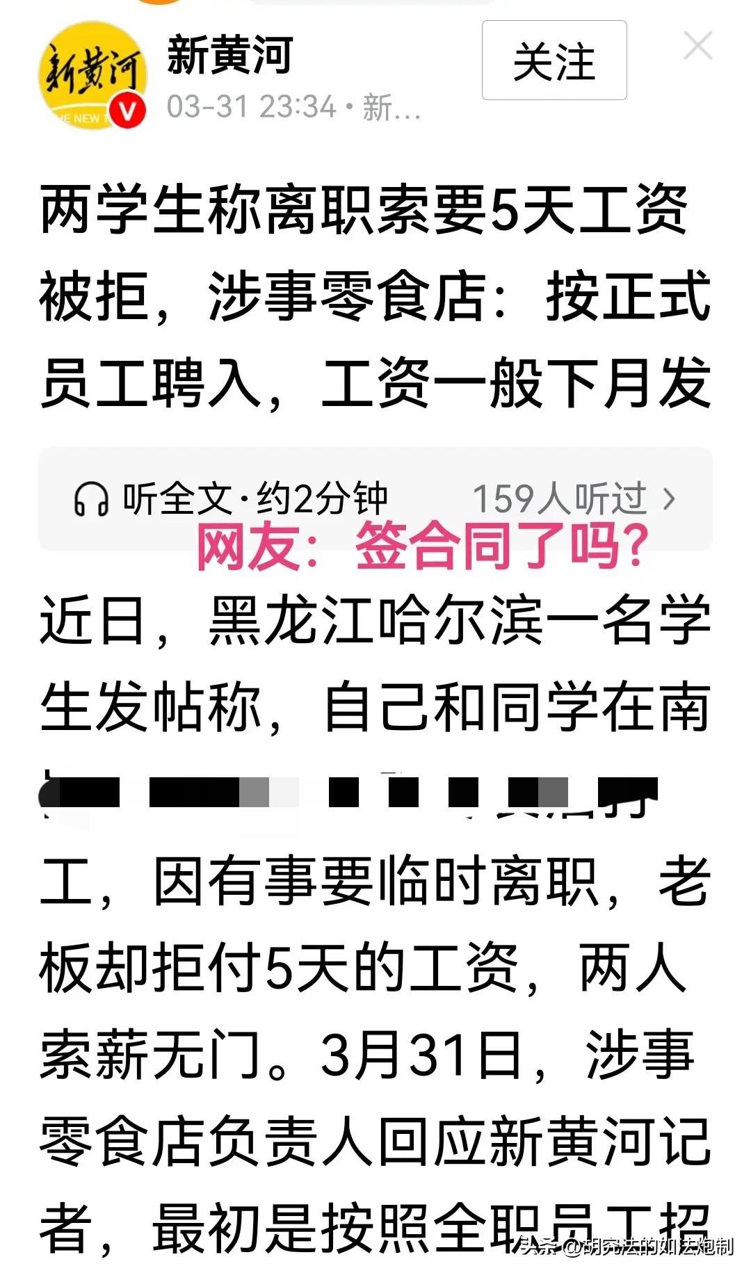 这就是知识的力量!黑龙江哈尔滨,一大学生在零食店兼职打工,离职后,老板还拖欠5天的工资。大学生先是报了警,又发帖对零食店曝光。零食店老板:说好干一个月,结果5天就辞职,不断的发帖要工资,已经给店铺声誉造成影响了!网友:差点就错怪好人了! 一男子是在校大学生,因为临近毕业了,课程根本就不多,为了能提前感受社会的美好,男子便和好朋友一起,找了份零食店兼职的工作。 这年头长期的工作都不好找,更别说兼职了。起初店老板也不太愿意,不过念其大学生的身份,再加上男子承诺,会干满一个月,店老板最后还是答应了。 谁曾想,两个大学生在店里才干了5天,便突然提出了离职。 店老板挺生气的,当初招他们两个过来,就意味着占据了两个工作机会。可他们突然辞职,店里根本就忙不开了,只能临时招人。 看着店里的员工忙不过来,店老板只能亲自上阵,一边干活,一边暗暗发誓:就算是说的再好听,也不招临时的了! 店老板本以为,他们的缘分到此结束,没想到男子又来了,是来讨要这5天的工资的。 店老板强压住内心的火气,向两人解释:把你们俩招进来,是按照全职员工的标准执行的。全职员工的工资要在下个月一起发放! 从店老板的恢复中不难看出,店老板没打算拖欠工资,只是打算下个月统一发放! 可这话进到了两个大学生耳朵里,就不是这个味了! 只要当场不给钱,一律视为拖欠工资! 为了给店老板施加压力,两个大学生充分利用自己的知识,通过网络平台发帖,讲述自己为期五天的打工生涯,而且还有过两次加班的经历,可谓是非常辛苦! 可店老板竟然拖着工资不给,实在太可恨了! 一时间,很多网友也纷纷为两个大学生鸣不平,认为店老板的做法实在是不地道,年轻人出来闯荡社会,本来就应该多一些包容,结果还没毕业,就被社会给“上了一课”。 看见网友如此支持,男子也决定继续为自己讨回公道,先是报警,接着向当地有关单位申请仲裁。 由于双方并没有签订劳动合同,再加上当事人是在校学生的身份,仲裁单位不予受理,不过建议走法律程序。 可事实真的是这样吗? 为了查明真相,记者见到了零食店的负责人,双方刚一见面,对方便倒起苦水来。 按照店老板的说法,其实起初双方并没有太大的纠纷,主要就是大学生要求当时拿工资走人,可按照流程,工资是要等下个月一起支付的。 最让店老板无法接受的是,这两个大学生多次在网络上发布所谓的“避坑贴”、“求助贴”,直接曝光了店名。如今店铺的经营受到影响,声誉也有明显下降! 当初招聘他们过来,完全是想着帮他们一把,没想到最后,却成了这样的结果! 有人调侃,不能没有知识,知识能改变命运,也能保护自己。不过要注意方式方法,还要实事求是。店老板也没有说不给工资,只是说等下个月一起给。 《民法典》第1024条规定,民事主体享有名誉权。任何组织或者个人不得以侮辱、诽谤等方式侵害他人的名誉权。 名誉是对民事主体的品德、声望、才能、信用等的社会评价。 两个大学生不知道是没听明白,还是担心店老板不认账,坚持要当场拿工资,为了达成这个目的,多次发布相关帖子,殊不知,已经对店铺的名誉造成侵害了。 也有人认为,说好的干一个月,结果干了5天就跑了,非常理解店老板当时的心情。不过两个大学生在店里干了5天,而且还加了两次班,这工资怎么也得结一下才说得过去。 对此你怎么认为?