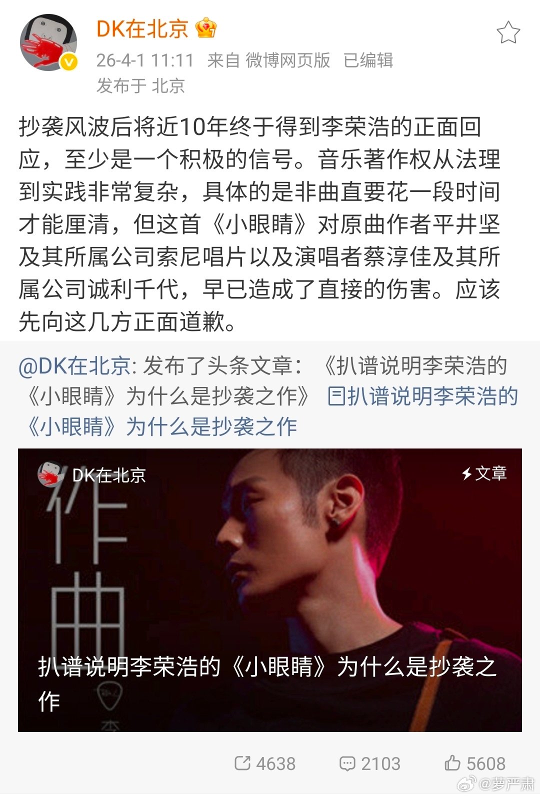 十年前扒谱对比抄袭的乐评人邓柯表示:“但这首《小眼睛》对原曲作者平井坚及其所属公司索尼唱片以及演唱者蔡淳佳及其所属公司诚利千代,早已造成了直接的伤害。应该先向这几方正面道歉。”(图3)