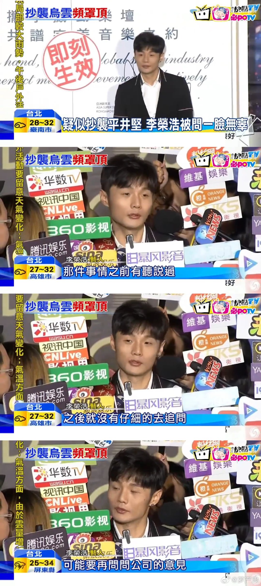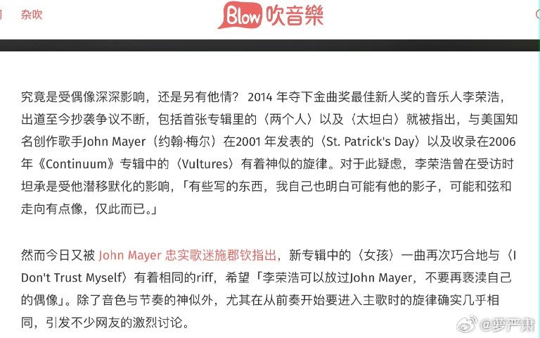 目前尚未回应他的多首歌曲与John Mayer雷同问题。2016年他曾回应此问题称:“没有办法啊,歌都已经发了,而且我觉得没有那么严重啊。”(图4~图5)
