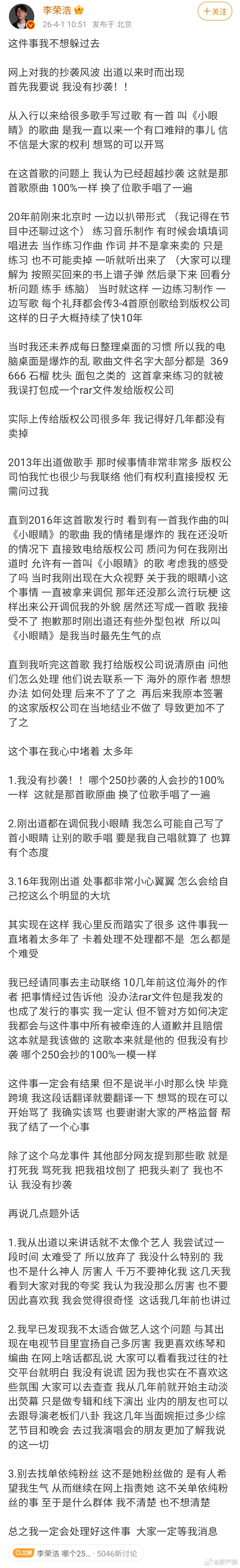 李荣浩承认《小眼睛》与平井坚《signal》是同一首曲子但否认抄袭,称是扒带练习曲误发给版权公司:“我没有抄袭!!哪个250抄袭的人会抄的100%一样 ,这就是那首歌原曲,换了位歌手唱了一遍。”(图1)