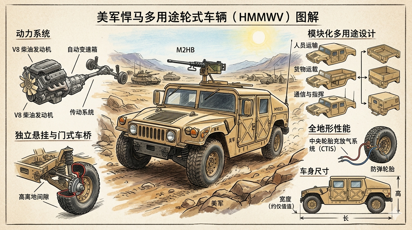 该车辆于1980年代初开发,旨在取代老旧的M151吉普车、M715等轻型战术车辆,满足1/4吨至1¼吨级多用途需求。其设计强调高机动性、可靠性和模块化配置,自1985年正式服役以来,已生产超过28万辆,并出口多个国家。