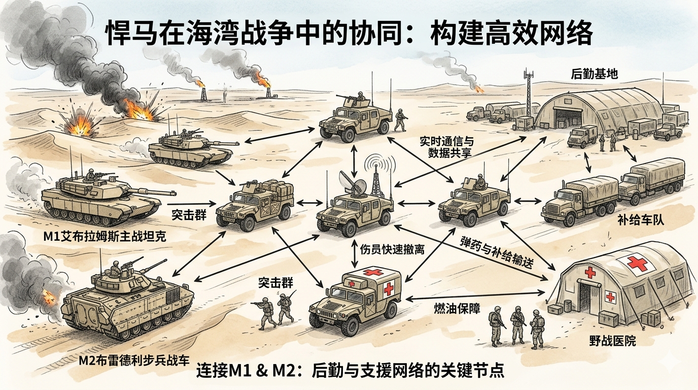 在1991年海湾战争中,悍马首次大规模投入实战。美军部署了数万辆该车辆,用于沙漠地形中的人员运输、侦察、指挥和武器平台。其高地面间隙和四驱系统出色应对沙地机动,结合M1 Abrams坦克和M2 Bradley战车,形成高效的后勤与支援网络。战争中损失相对较低,主要因其设计用于非一线直接对抗环境。