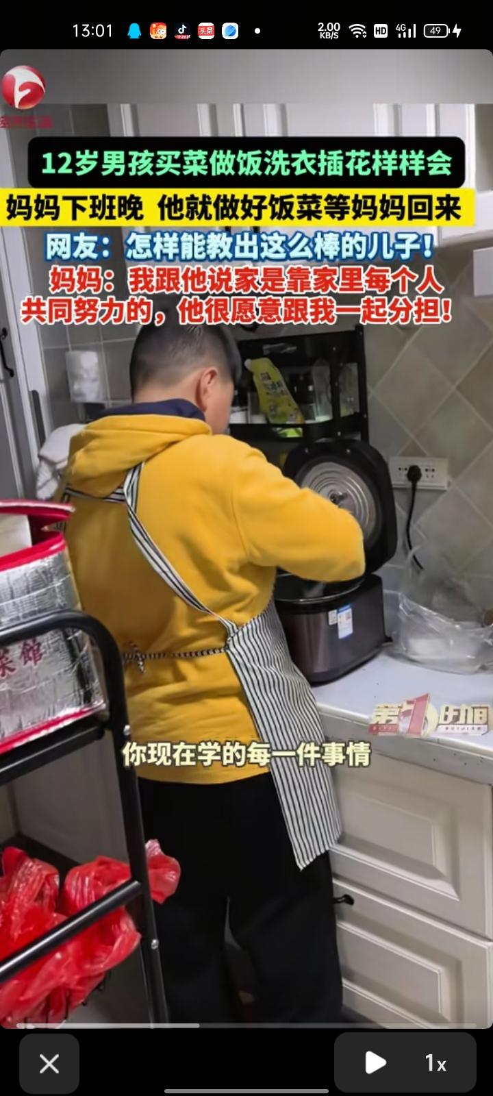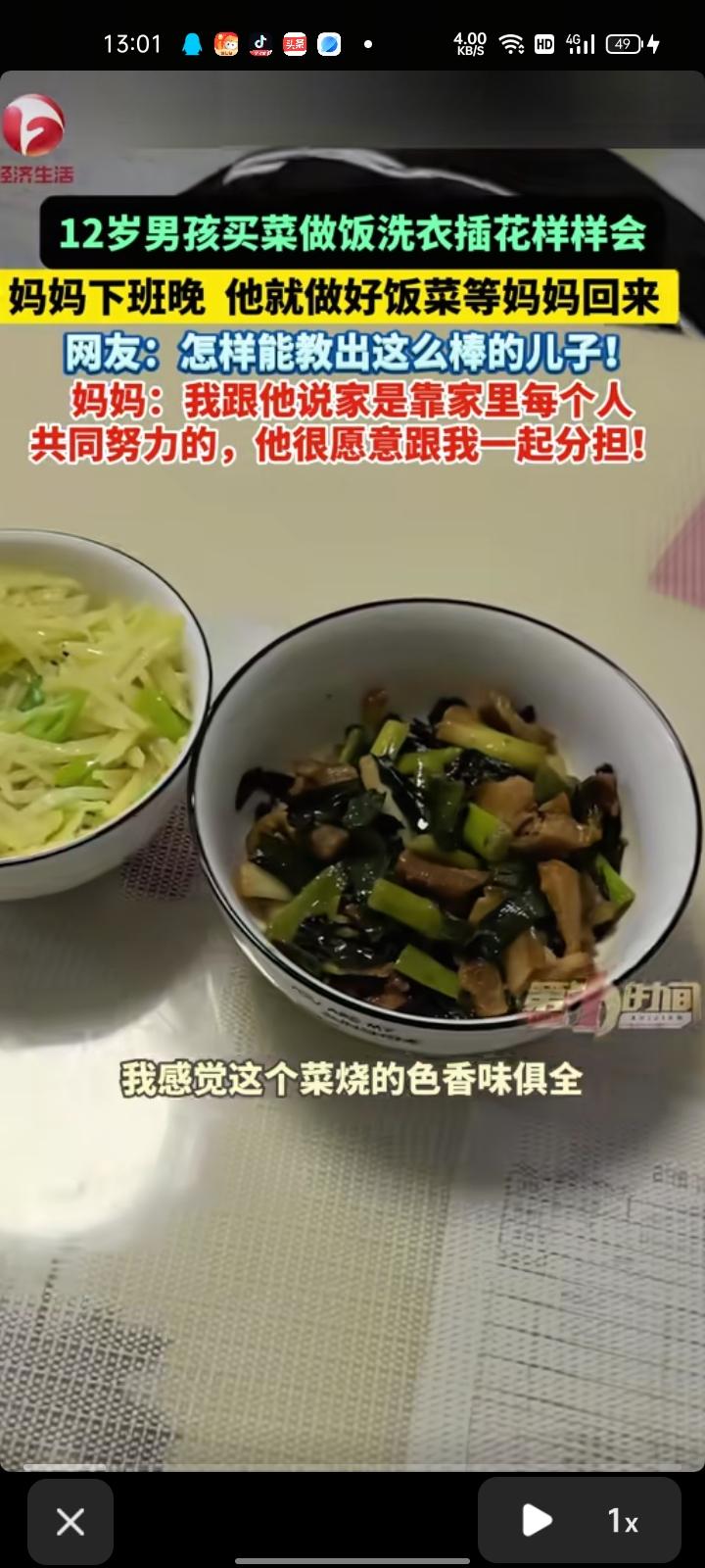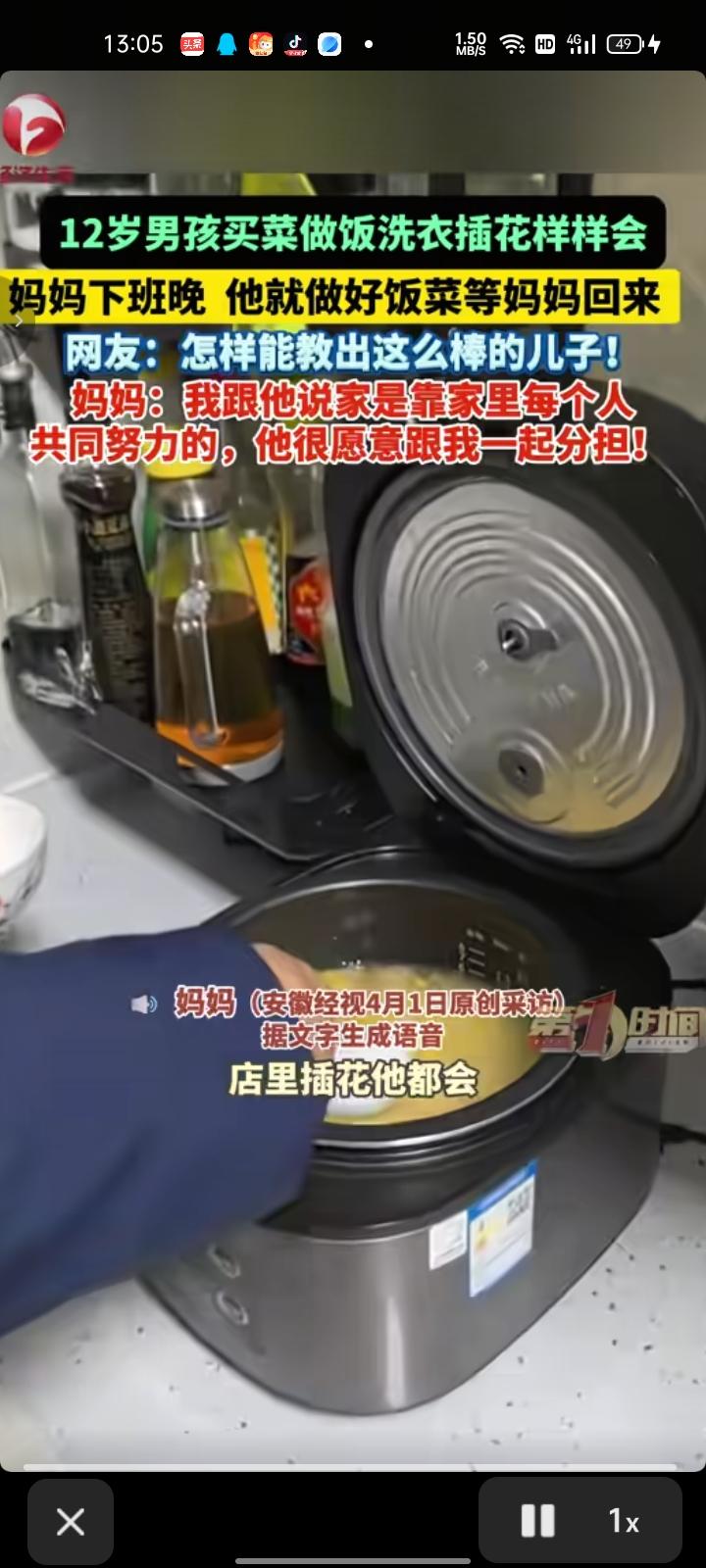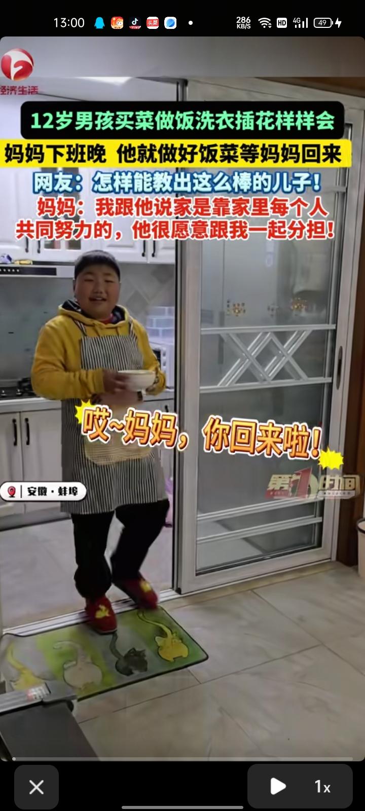 4月1日,安徽蚌埠。12岁儿子买菜、做饭、洗衣啥都会,因为妈妈下班晚,他就做好饭菜等妈妈回来,感觉孩子懂事了,体谅妈妈的辛苦。 孩子妈妈表示,每次烧饭都会喊儿子帮忙,时间久了他就学会了。给儿子灌输的是家是靠家里的每个人共同努力,他愿意和自己一起分担。