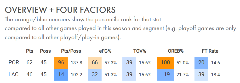 开拓者半场50%+的前板率,他们场均二次进攻18.9分联盟第一,今天半场19分,