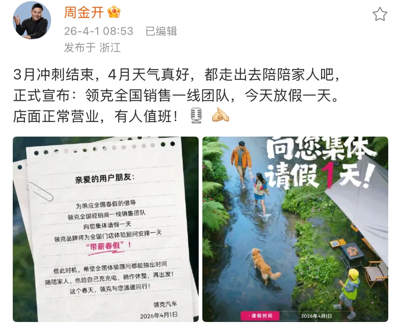 领克宣布全国销售放1天春假汽车行业做了这么多年了,说实在的一线销售岗位在节假日的时候是最没得休息的,企业能有这样的举措真值得点赞
