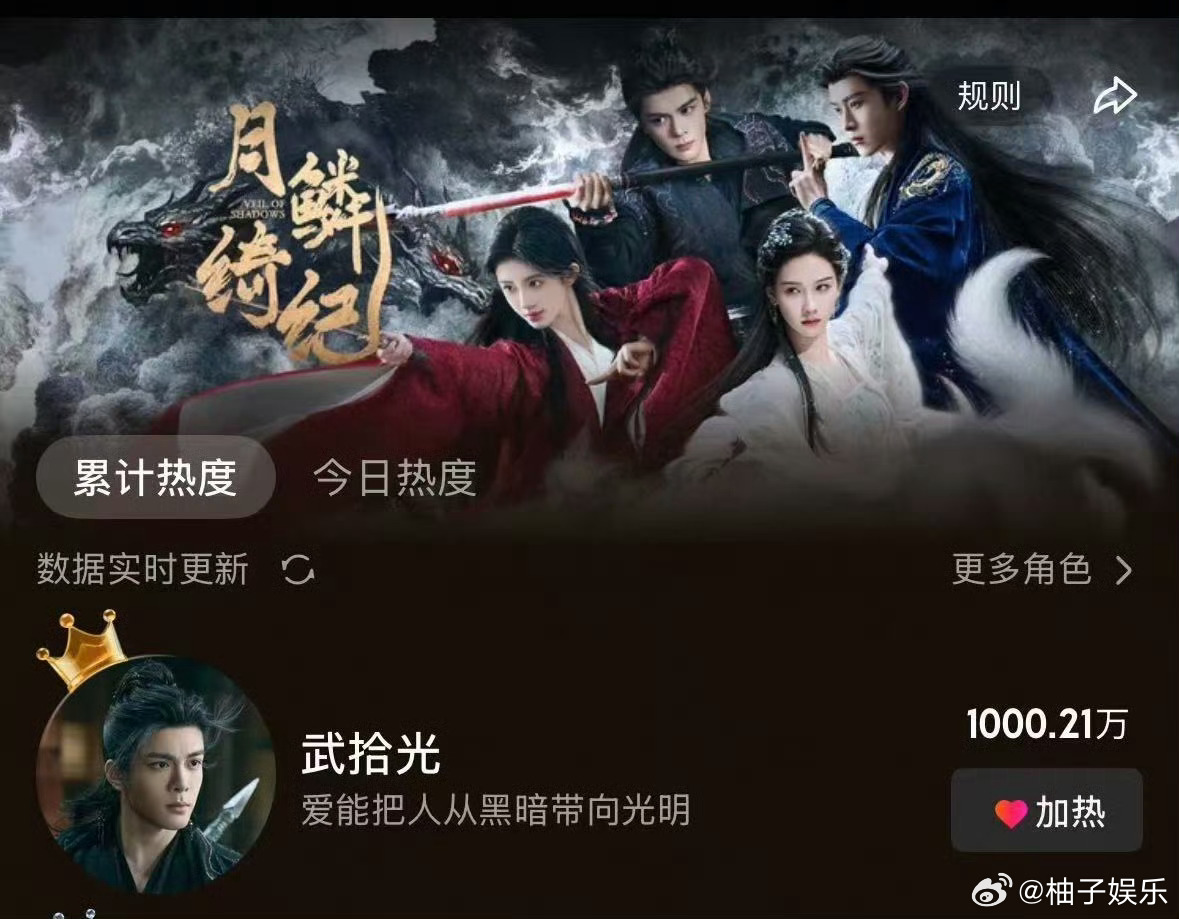 曾舜晞武拾光角色热度破千万,恭喜成为优酷首个热度破千万的男性角色,才开播十五分钟,太厉害了!