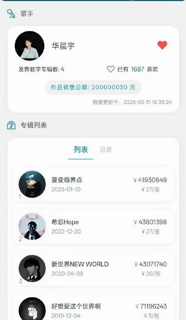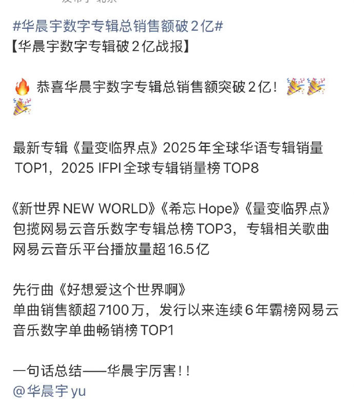 华晨宇数字专辑总销售额破2亿