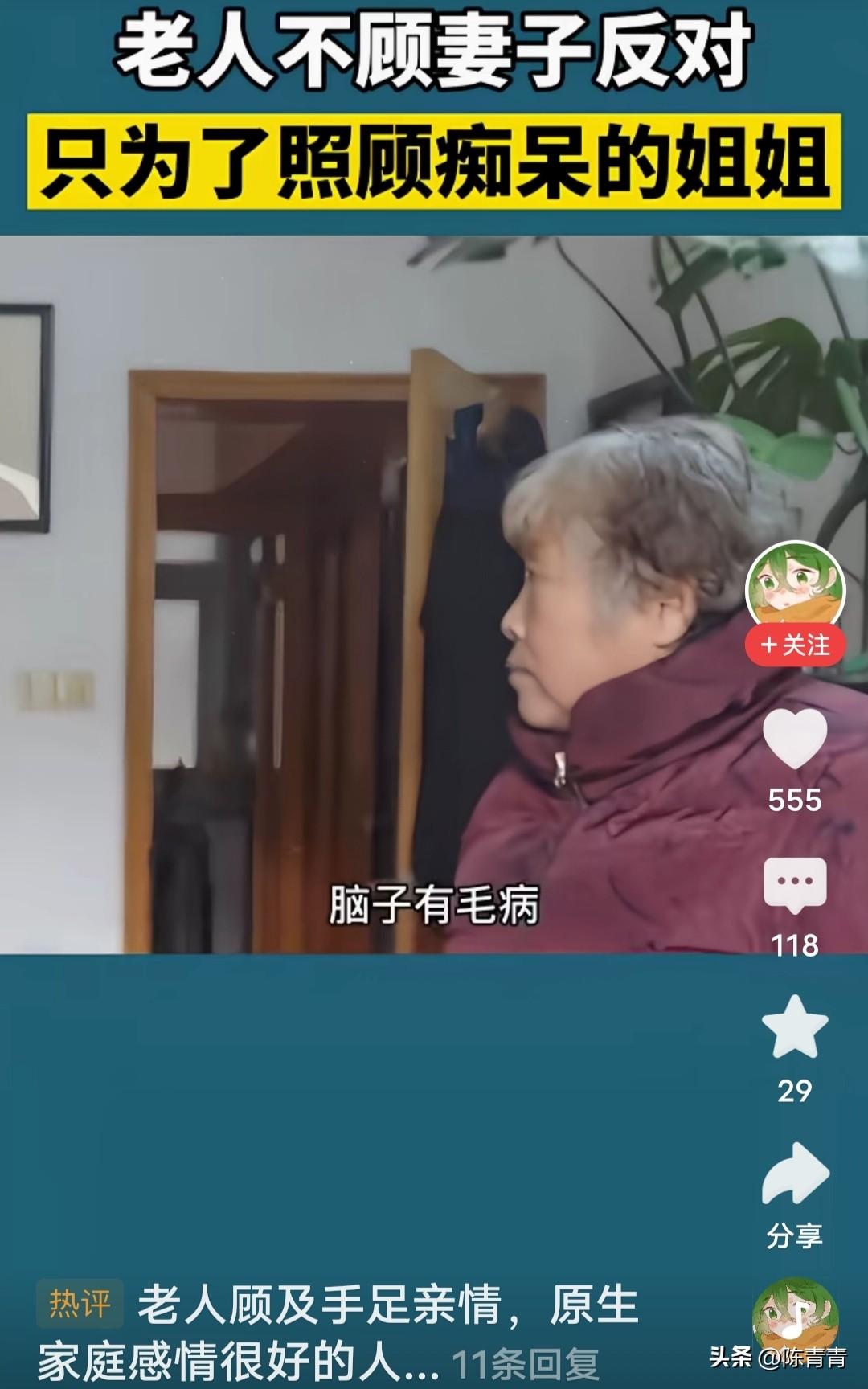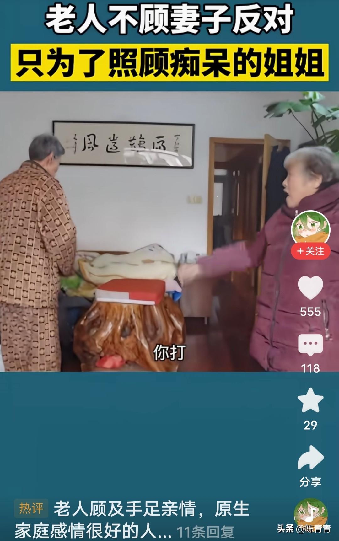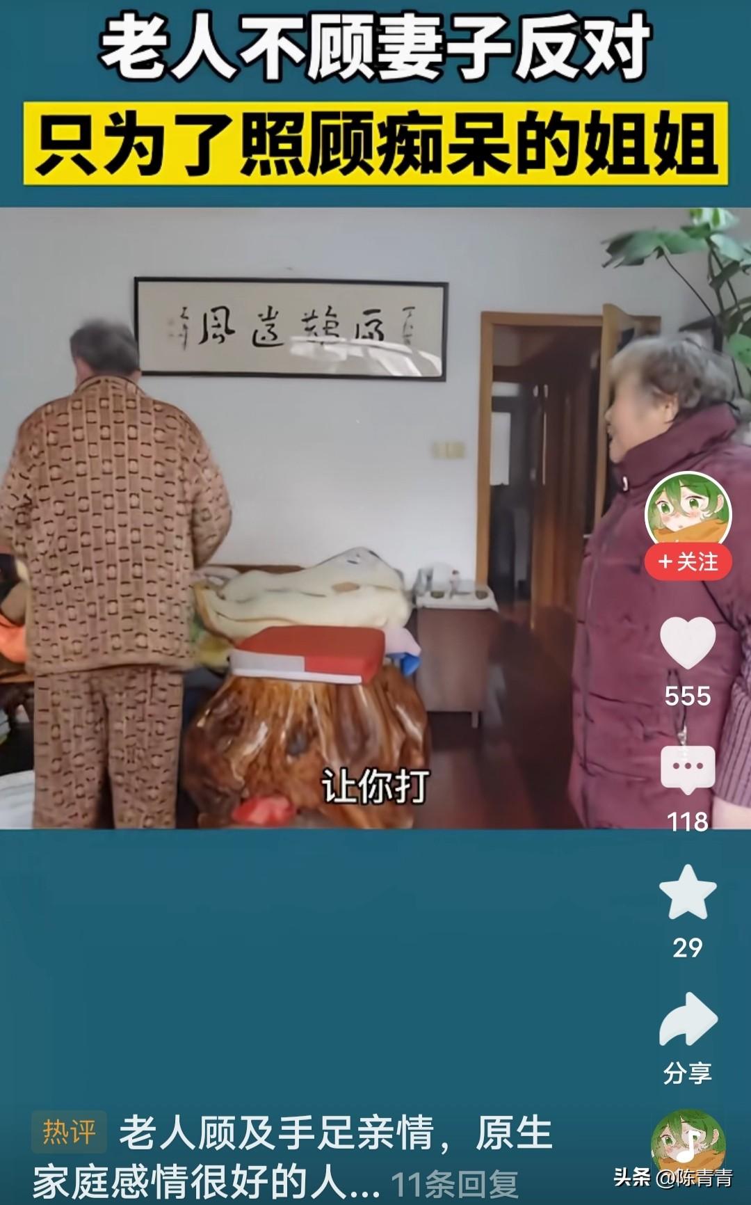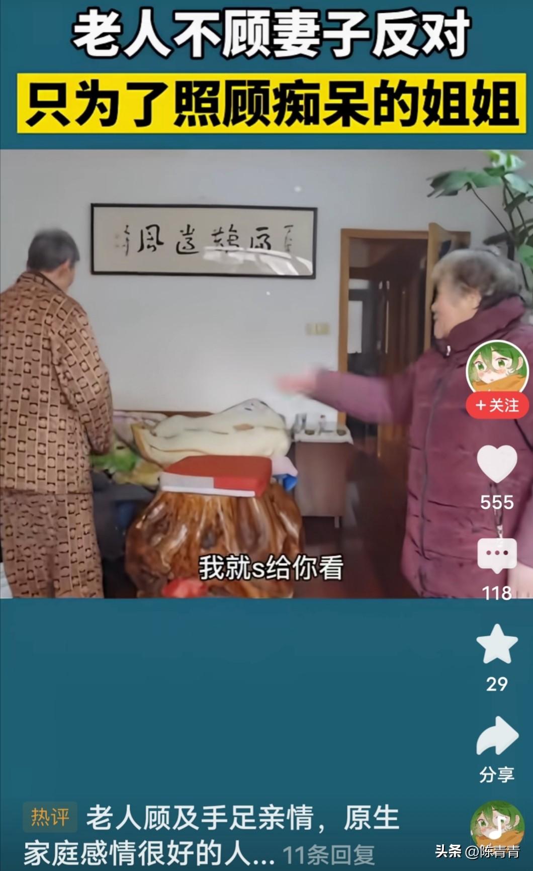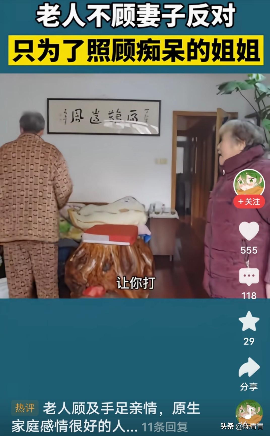 老人不顾妻子反对,只为照顾痴呆姐姐。为这事老两口撕破脸皮又动粗口了。 老爷子说,“你脑子“好”,我非要打你……”老太太也不示弱,“你打,我让你打,我就死给你看……” 老两口你一言、我一语,针尖对麦芒,谁也不让谁。那问题出来了,老爷子该不该照顾痴呆姐姐呢? 话要两头说,假如姐姐没有了父母照顾,她孤孤单单一人,弟弟去照顾也在情理之中。如若她有老公有子女,当弟弟的不去照顾也能说过去。 有网友说,“我现在60岁,假如有一天我姐姐也这样,我也会照顾姐姐。因为姐姐为我们家做的太多太多了。” “老人顾及手足亲情,这说明原生家庭感情很好。” “一看就是在家不干活,说是接到家里照顾,其实还是老婆照顾。很多人就是嘴好。” “我看过完整的视频,他妻子已经照顾婆姐十年了。她是刀子嘴豆腐心。” 老人照顾值痴呆姐姐应该吗?