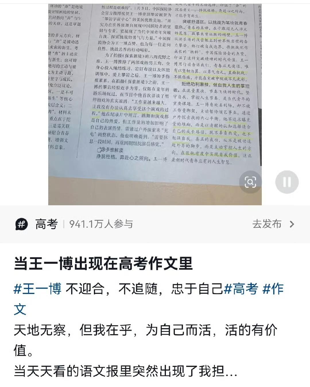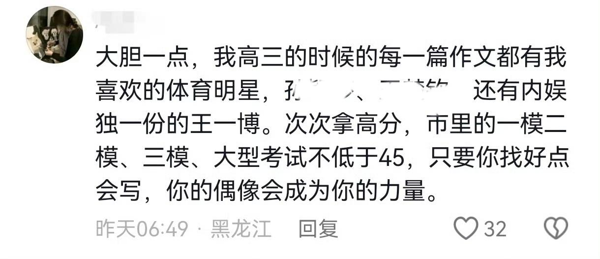 王一博的正能量和优秀,就是他出现在哪里你都不会觉得惊讶[大金牙]。 王一博,再次出现在语文报的高考作文热点命题导写范文里!👍🏻。 天地无察,但我在乎,“挣脱桎梏,奔赴心之所向”,“拒绝功利裹挟,做自我人生的掌控者”。 当“王一博”成为一种符号,成为积极向上热血青春的“代言人”,王一博真正为“偶像的力量”正了名。 成为别人的力量,王一博实至名归。 王一博