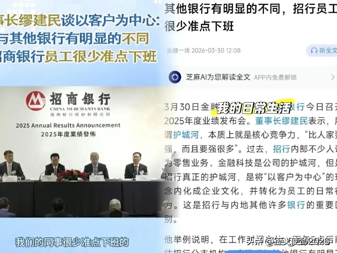 一觉醒来,招商银行的董事长的天塌了,他怎么也想不到,自己讲的那番话,他的员工可以放过他,但是网友却不放过他。堂堂一个国内排名前列、利润那么丰厚的头部大银行,掌门人居然在台上面带微笑,把“员工不准点下班”当成光荣事迹在那大肆炫耀。 这事儿发生在3月30日招行的业绩发布会上,董事长缪建民侃侃而谈,说招行真正的护城河不是什么金融科技,而是“以客户为中心”的文化。怎么证明这文化厉害呢?他举了个例子:下午5点后去网点看看,招行员工很少准点下班,跟其他银行“形成鲜明反差”。话音还没落,舆论就炸了锅。把违反《劳动法》基本准则的事儿当成核心竞争力,这哪是什么护城河,分明是给员工套上了一副看不见的枷锁。 缪董事长或许是想夸员工敬业,可这话听在打工人耳朵里,完全变了味。2025年招行净利润高达1501.81亿元,日赚超过4个亿。银行赚得盆满钵满,却把“不准时下班”当成企业文化来炫耀,这背后的潜台词让人心寒:在资本的眼里,员工牺牲休息时间、透支身体似乎成了天经地义的事。可别忘了,那几百亿的利润背后,是多少个灯火通明的夜晚,是多少张疲惫却不敢离开工位的面孔。 更让人觉得讽刺的是,招行一边在台上讲奉献,一边在账本上算得精明。数据显示,2025年招行员工人均薪酬从上一年的58.1万元降到了56.49万元。说白了,钱少挣了,班却没少加,甚至加出了“自豪感”。这种既要马儿跑,又要马儿不吃草,还得让马儿自己觉得光荣的逻辑,真当现在的职场人还活在二十年前吗? 把“不准点下班”当作护城河,本质上暴露的是管理上的懒惰和战略上的短视。有评论说得好,这叫用“人肉电池”的人力损耗来弥补系统流程的缺位。如果一家头部银行的竞争力,是靠员工用命拼出来的,那还要科技干什么?还要管理干什么?真正的护城河,应该是让员工在8小时内高效创造价值,而不是看谁在工位上熬得更久。 网友的评论一针见血:“原来招行的护城河,是员工的泪与汗砌成的”。还有人说,把违法当作光荣,这本身就是对劳动法的漠视。这话说到了根子上。《劳动法》白纸黑字写着每日工作不超过8小时,加班需要协商并支付报酬。可现实中,这种“无偿加班”“被动加班”成了常态,甚至被包装成“奋斗精神”拿来宣讲。更要命的是,给那些准时下班的人贴上“不努力”的标签,这种氛围比加班本身更可怕。 国家层面其实早就看到了“内卷”的危害,反复强调要反“内卷式”竞争,保障劳动者的休息权。这不仅是让员工能喘口气,更是为了刺激消费、提升生活质量。如果大家都被摁在工位上耗时间,哪来的时间去消费、去享受生活?从这个角度看,招行董事长这番不合时宜的言论,简直是在给当前的“反内卷”氛围拖后腿。 再把话说回来,缪建民董事长觉得“很少准点下班”是招行区别于其他银行的优势,可他可能没意识到,这恰恰暴露了招行在内部管理上的短板。业务承压、信用卡交易额下降、合规罚单不断,这些真问题不去解决,反而把精力花在歌颂加班上。就算员工天天熬到深夜,如果方向错了、效率低了,又能守住什么护城河? 其实大家心里都明白,没有人反对真正的奋斗,大家反对的是那种无意义的消耗,是被迫的形式主义,是把牺牲当成功绩的冷漠。一家真正伟大的企业,敢不敢说“我们不仅服务好客户,更善待自己的员工”?敢不敢比一比谁能准时下班还能把活干得漂亮? 各位读者你们怎么看?欢迎在评论区讨论。
