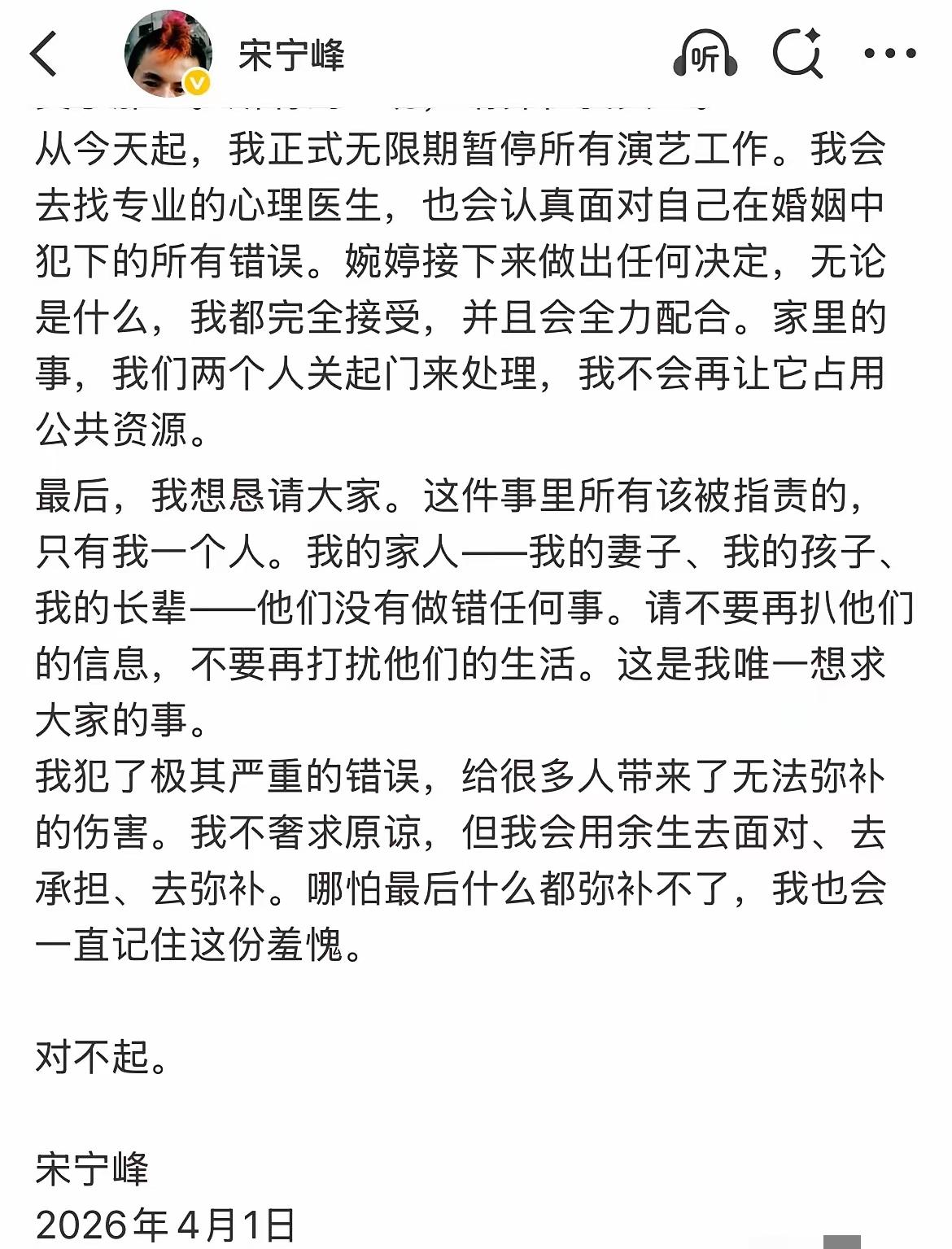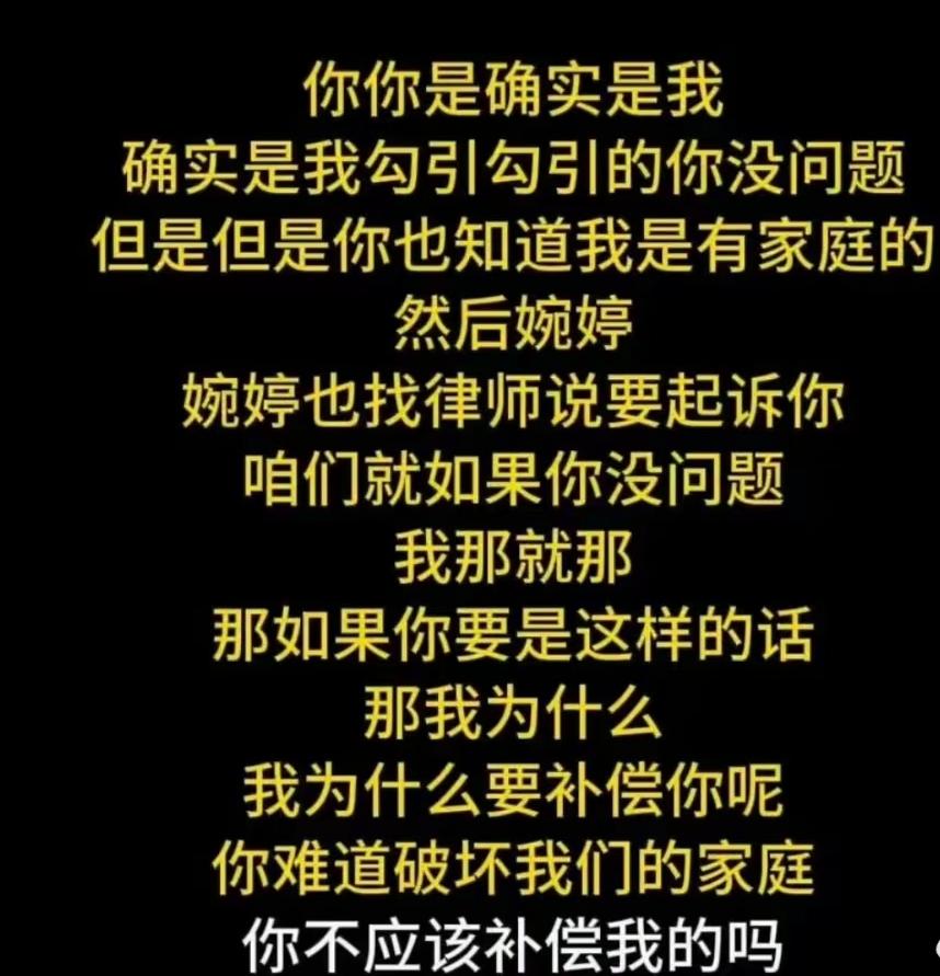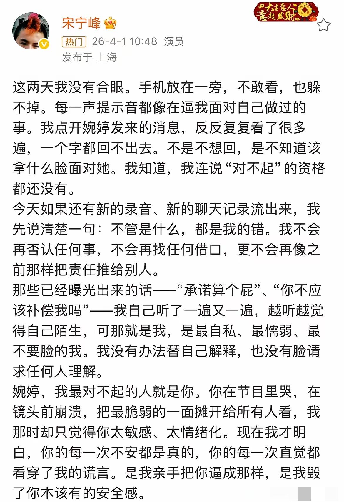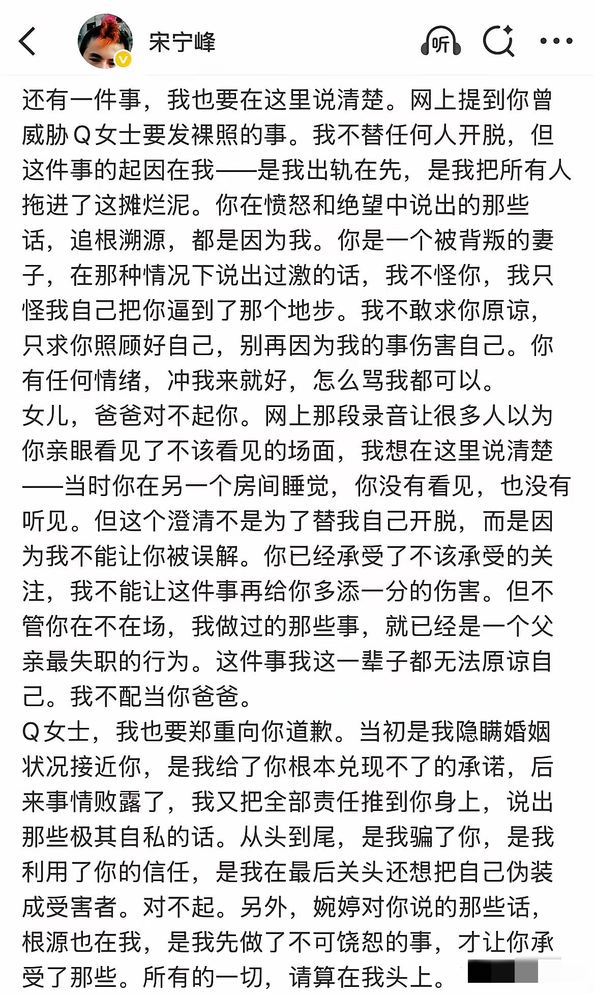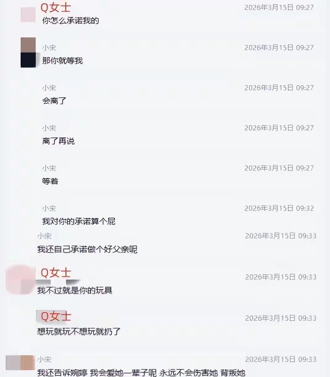从隐忍好丈夫,到实锤婚内出轨带女儿私会,宋宁峰这次算是彻底凉凉了。 刚翻红没多久,宋宁峰就被妻子实锤出轨圈外Q女士。他与Q女士相识于一场商务酒会,宋宁峰几乎是一见钟情,之后以金钱攻势,甜言蜜语一次次的承诺终于是得到了Q女士的芳心。 两人本以为做的是天衣无缝,可没有不透风的墙,在张婉婷翻看宋宁峰手机时事情终于败露。 事发后宋宁峰非但没有低头认错,还妄图说服Q女士一起撒谎帮他隐瞒。没想到的是,Q女士也是忍无可忍,在宋宁峰一次次的承诺与张婉婷离婚中失去耐心。 看了两人的聊天记录,宋宁峰不但渣还没有男人的担当: 1.带女儿与Q女士私会,孩子目睹亲密动作,之后让孩子不要告诉妈妈。 2.对Q女士说,你也知道我有家庭,我为什么补偿你,你破坏我们家庭,你不应该补偿我吗? 3.承诺算个屁,我还承诺做个好父亲呢,我还告诉婉婷会爱她一辈子,永远不会伤害她,背叛她。 更有意思的是张婉婷,此时不是去质问渣男丈夫,而是变身“护夫狂魔”,手撕Q女士,用裸照威胁,让Q女士在她的世界消失,不是一家人不进一家门。 甚至评论区里还有对宋宁峰怜悯,同情他的遭遇,认为出轨是因为张婉婷太强势导致的。 出轨就是出轨了,这是事实,不能用家庭中处于弱势的幌子来打掩护,那是对家庭的不尊重,对夫妻双方不公平。既然日子真的过不下去,完全可以离婚,何必要用出轨来做借口。 渣男就是渣男,没有任何借口,宋宁峰说会无限期停止演艺工作,这是他最好的选择,不要脏了观众的眼。 宋宁峰演员宋宁峰被曝婚内出轨