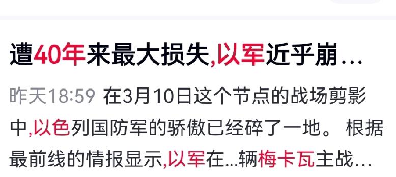彻底破防!以军40年最惨溃败,梅卡瓦神话彻底崩塌 谁能想到,号称中东无敌的以色列军队,竟在黎巴嫩遭遇数十年未有之惨败! 突袭黎巴嫩南部小镇的军事行动全面失利,3月26日更是迎来致命伏击:黎方诱敌深入,用低成本FPV无人机多方位合围,单日直接摧毁21辆梅卡瓦坦克,创下以军四十余年最惨重单日装甲损失,逼得以军紧急叫停大纵深装甲推进计划,曾经的战场霸主彻底陷入被动。 梅卡瓦坦克的不败神话彻底崩塌,根本原因从来不是装备强弱,而是战争规则早已天翻地覆!以军死守传统装甲作战老套路,完全无视无人机非对称作战的新趋势,即便装备再先进,也抵不过与时俱进的战术打法。 这一仗给全世界敲响警钟:固步自封必败,战术迭代才是战场王道!跟不上战争形态的革新,再强的纸面实力都是空谈! 对此,你怎么看? 国际局势 以军黎巴嫩军事失利