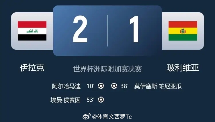 4月1日 26赛季世界杯附决赛B组,伊拉克以2-1力克玻利维亚,获得最后一张世界杯入场券,至此美加墨世界杯的48支参赛队全部产生。上半时比赛,哈马迪为伊拉克首开纪录,随后莱尼奥为玻利维亚扳平,下半时胡塞恩为伊拉克攻入制胜球。这也是伊拉克队史第2次获得世界杯入场券,该队上一次获得世界杯的参赛资格,还是1986年墨西哥世界杯,时隔40年,伊拉克队再次踏上世界杯决赛圈的舞台。