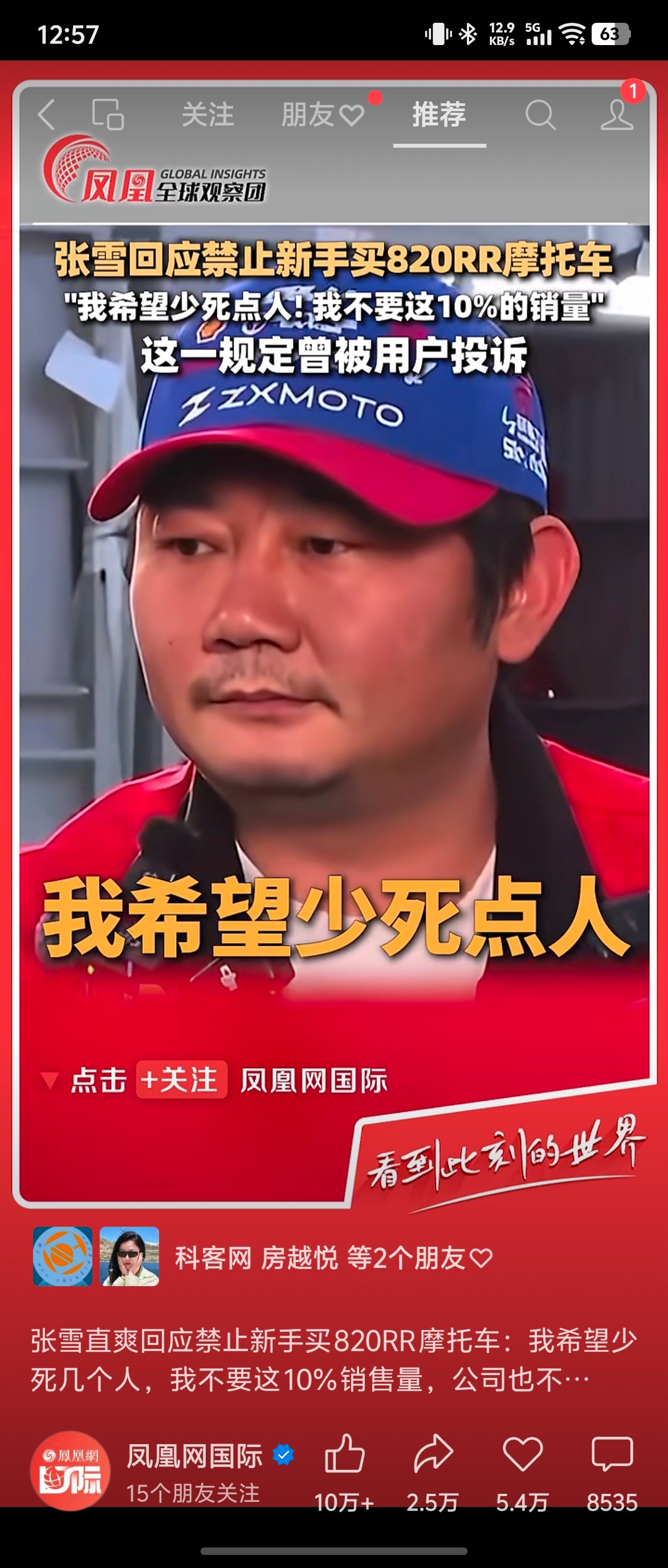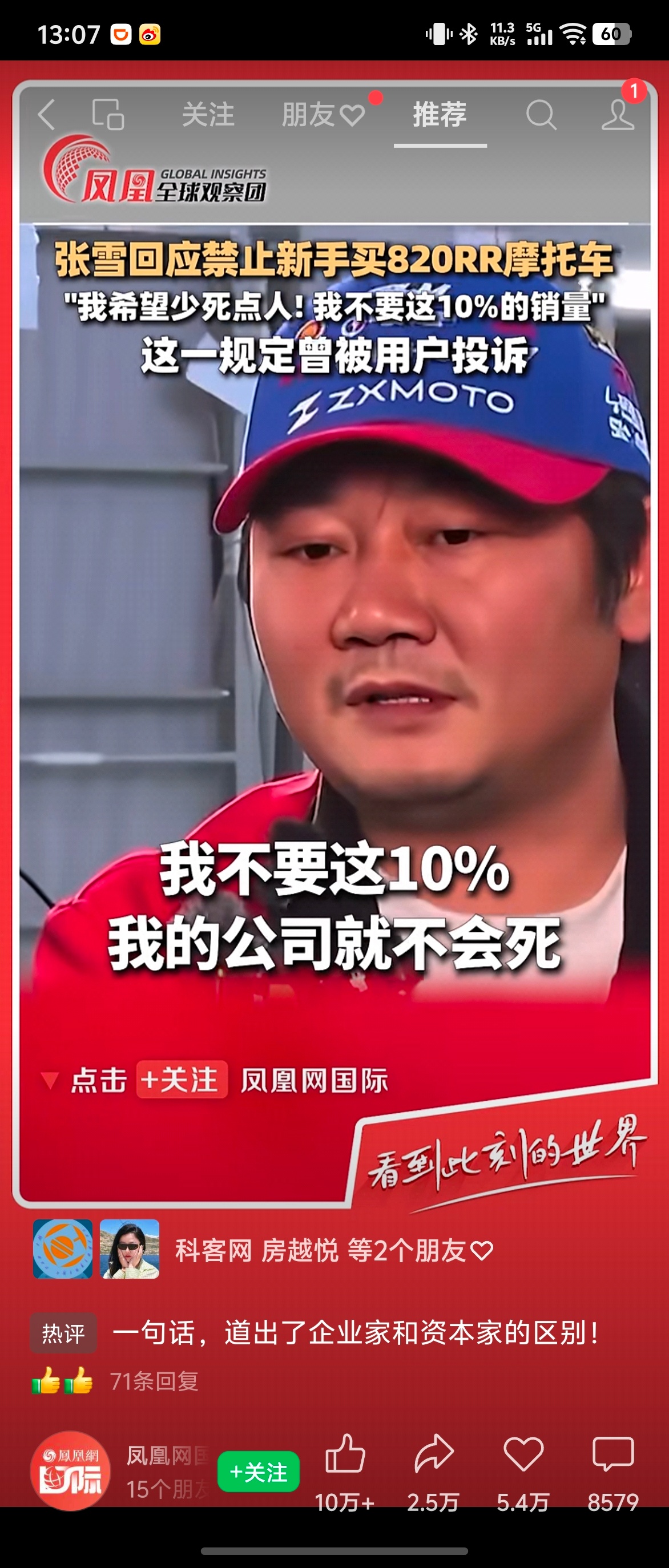 这两天大家都在议论张雪,和为他代表的中国高性能机车崛起甚至反超世界先进水平的新闻所振奋。我这两天也回看了他早年冒雨追着记者几十里山路,只为争取一个上电视圆自己当一个赛车手的梦想机会,我感觉到这个人的真诚,坚韧和纯粹的热爱。大家说他才是真正的“飞驰人生”当然,最令我动容的是下面这个视频里的采访,他说不给未满一年驾龄的新手卖820RR摩托车,因为就是“想少死点人”。