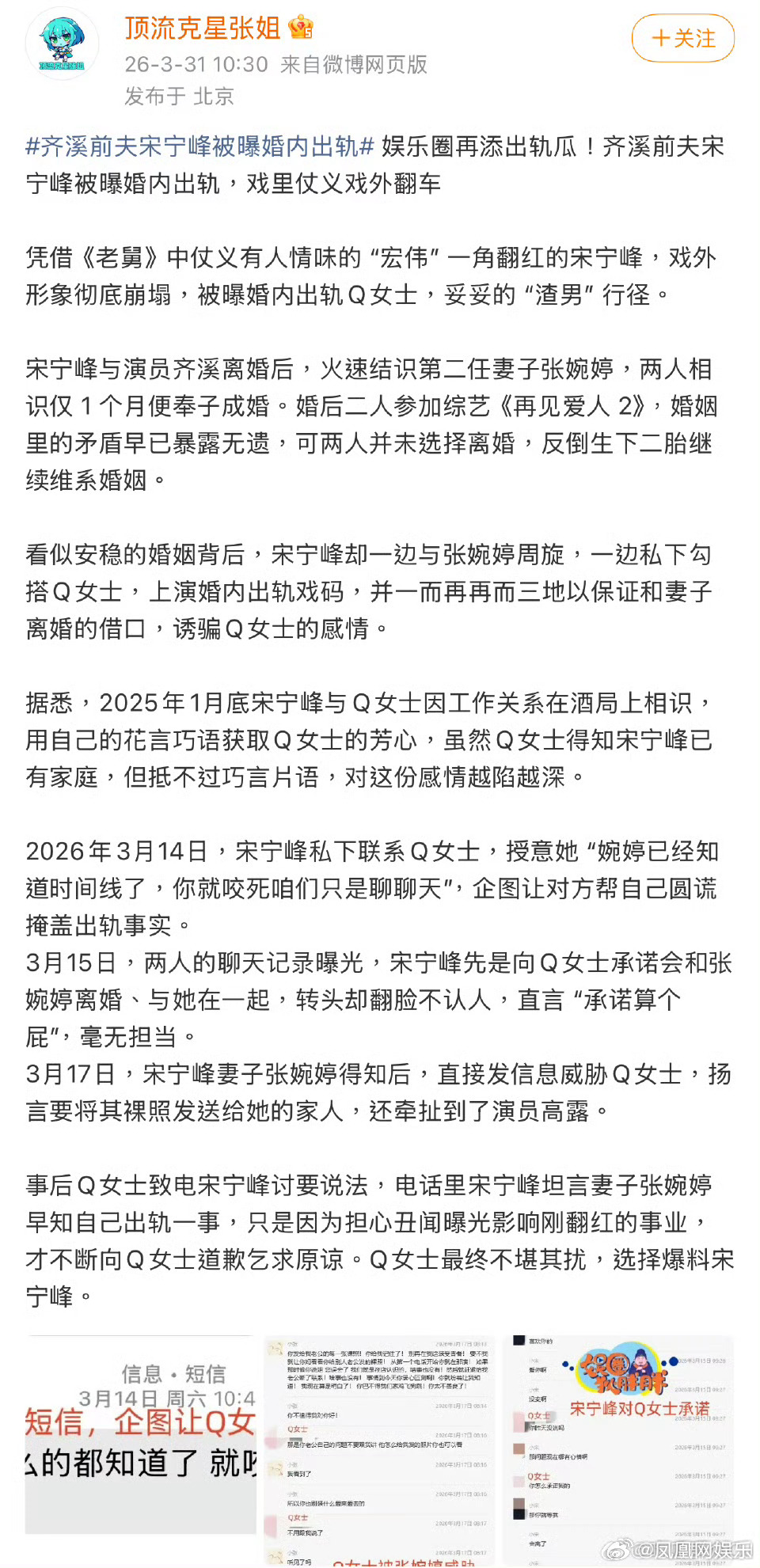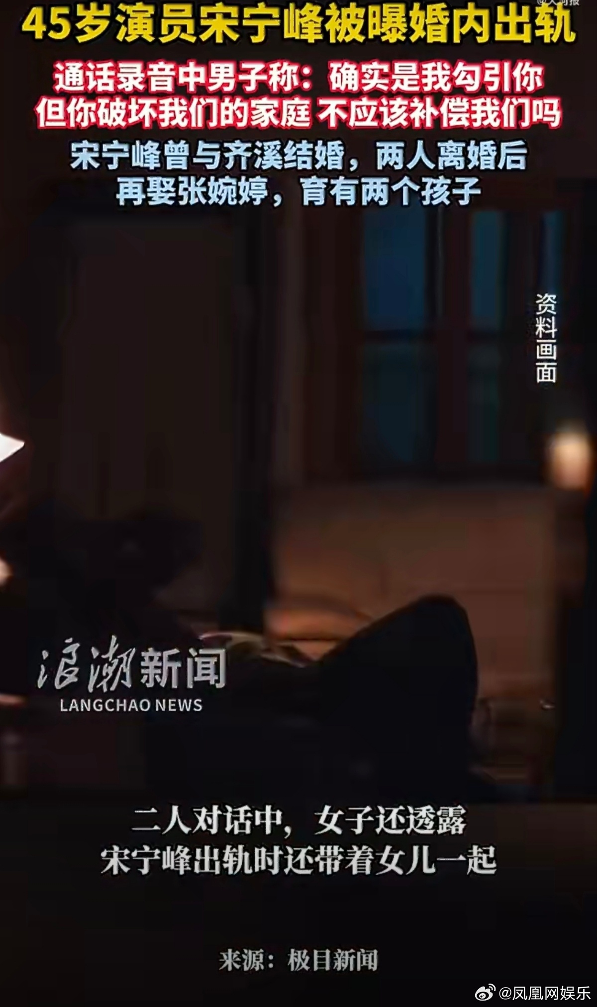 此前,3月31日,网友“Q女士”爆料宋宁峰婚内出轨她,两人在2025年1月认识,3月被宋宁峰妻子张婉婷得知。宋宁峰要求和她对口供,并承诺她会和张婉婷离婚,张婉婷则威胁Q女士,称要将其裸照发给家人。在Q女士曝光的与宋宁峰的录音中,提到了宋宁峰带着女儿跟她在床上。齐溪前夫宋宁峰被曝婚内出轨