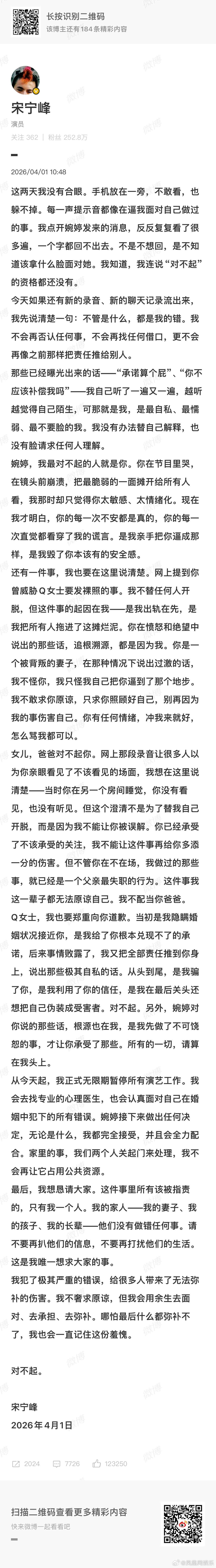 宋宁峰宣布暂停演艺工作宋宁峰回应婚内出轨4月1日,发长文回应婚内出轨,并向张婉婷、女儿以及Q女士道歉,同时宣布无限期暂停所有演艺工作,“婉婷,我最对不起的人就是你。是我亲手把你逼成那样,是我毁了你本该有的安全感。”“女儿,爸爸对不起你,是一个父亲最失职的行为。”“Q女士,我也要郑重向你道歉。从头到尾,是我骗了你,是我利用了你的信任,是我在最后关头还想把自己伪装成受害者。”表示会去找专业的心理医生,也会认真面对自己在婚姻中犯下的所有错误。