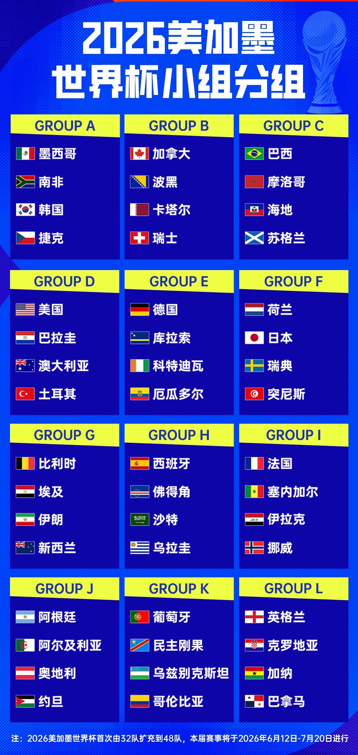 本届世界杯亚足联共9队参赛,创历史新高。随着,伊拉克2-1力克玻利维亚,时隔40年重返世界杯正赛,2026美加墨世界杯48支球队全部出炉!小组赛的完整分组及具体赛程也随之敲定。6支通过附加赛晋级的球队中,淘汰波兰的瑞典将与荷兰、日本、突尼斯同组,这是出线难度相对较高的一个小组。此外,最后一个晋级世界杯的伊拉克将与法国、挪威、塞内加尔同组。世界杯
