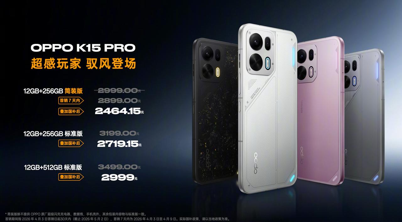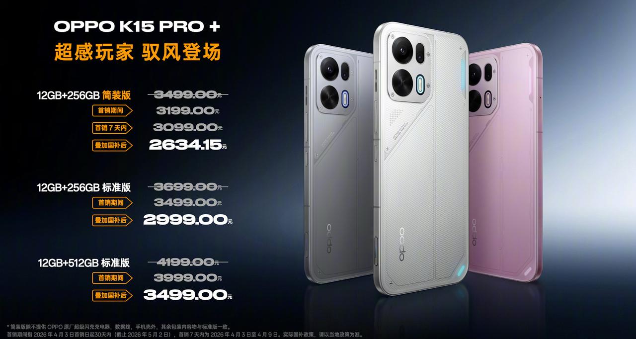 OPPO的K15 Pro系列登场,Pro和Pro+两款。 Pro是天玑8500 SUPER处理器,144Hz刷新率屏幕,7500mAh电池,呼吸灯、IP69防水等配置...... Pro+是天玑9500s处理器,165Hz刷新率屏幕,8000mAh电池;然后还有超感临场双扬、灵犀按键...... 售价上面这次除了标准版,还给了简装版。就是不配充电器数据线手机壳,两款都有提供这个版本,能省一百是一百。 K15 Pro标准版12+256G 3199元(国补2719.15元),12+512G 3499元(国补2999元),简装版12+256G 2999元,首销期间2899元,国补后2464.15元; K15 Pro+标准版 12+256G 3699元(首销3499元,国补后2999元),12+512G 4199元(首销3999元,国补后3499元),简装版12+256G 3499元(首销3199元,首销7天内3099元,国补后2634.15元)...... 这个价格有点看得眼花缭乱的感觉[泪奔]但是只有256G给简装版啊,512G都没有啊。其实要不可以都砍了充电器得了?近一点时间的新机,应该都会是首销期间优惠是最多的了。而且各家明显的首销期都缩短了。之前首销可以维持一个月,现在只剩下7天10天之类的。