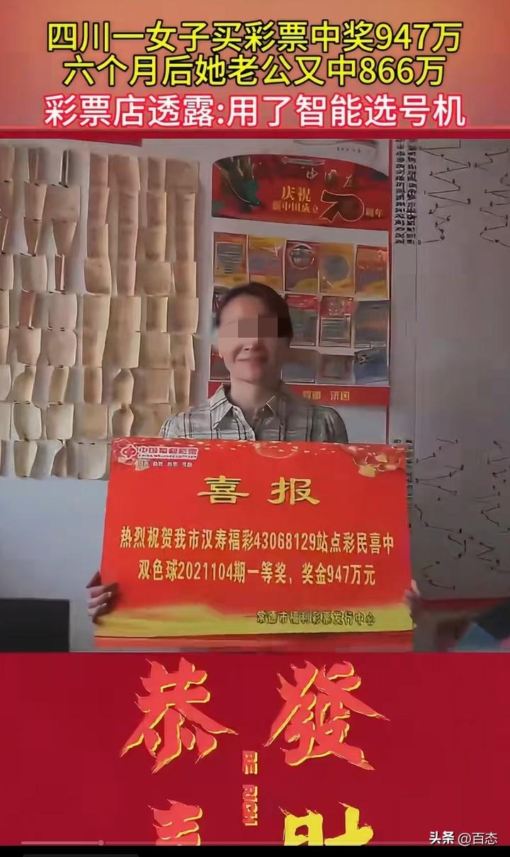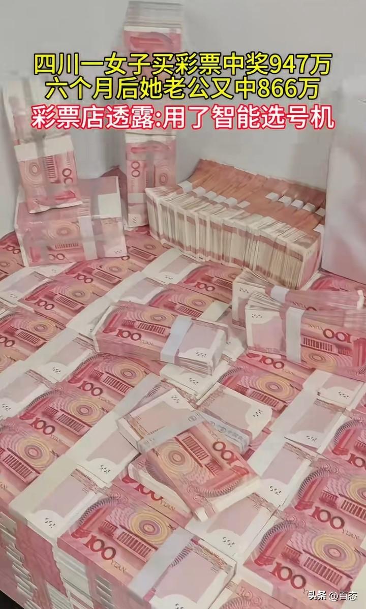 见过运气好的,没想到四川一对夫妻先后中大奖,而且是隔了不久。 四川一女子买彩票,没想到中了双色球一等奖,奖金高达900多万。万万没想到的事,女子的老公时隔6个月,也中了双色球一等奖,奖金高达800多万。 而他们选好居然是用智能选号机选的,这运气也是太好了。 大家都知道,中一等奖的概率非常低,一对夫妻居然都中一等奖,不得不说运气非常好。 你们身边有没有中过大奖的人呢?