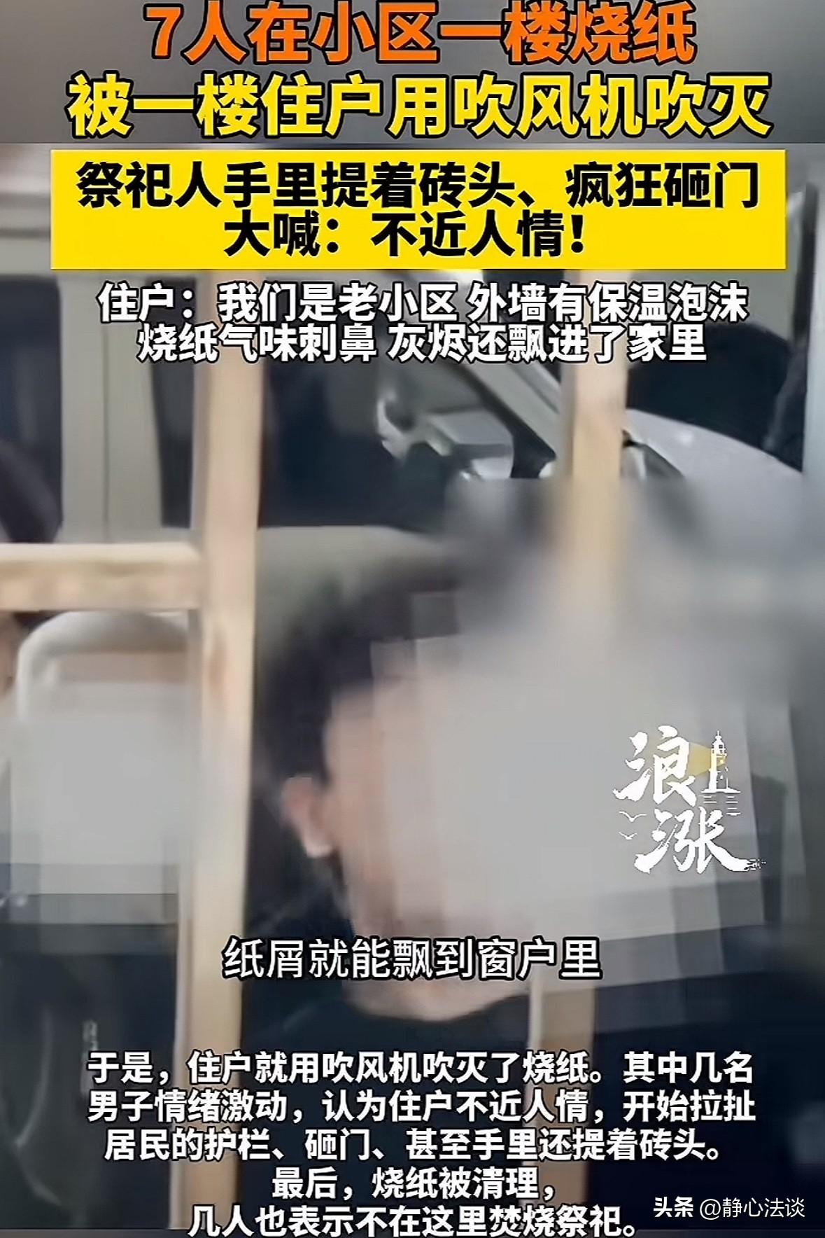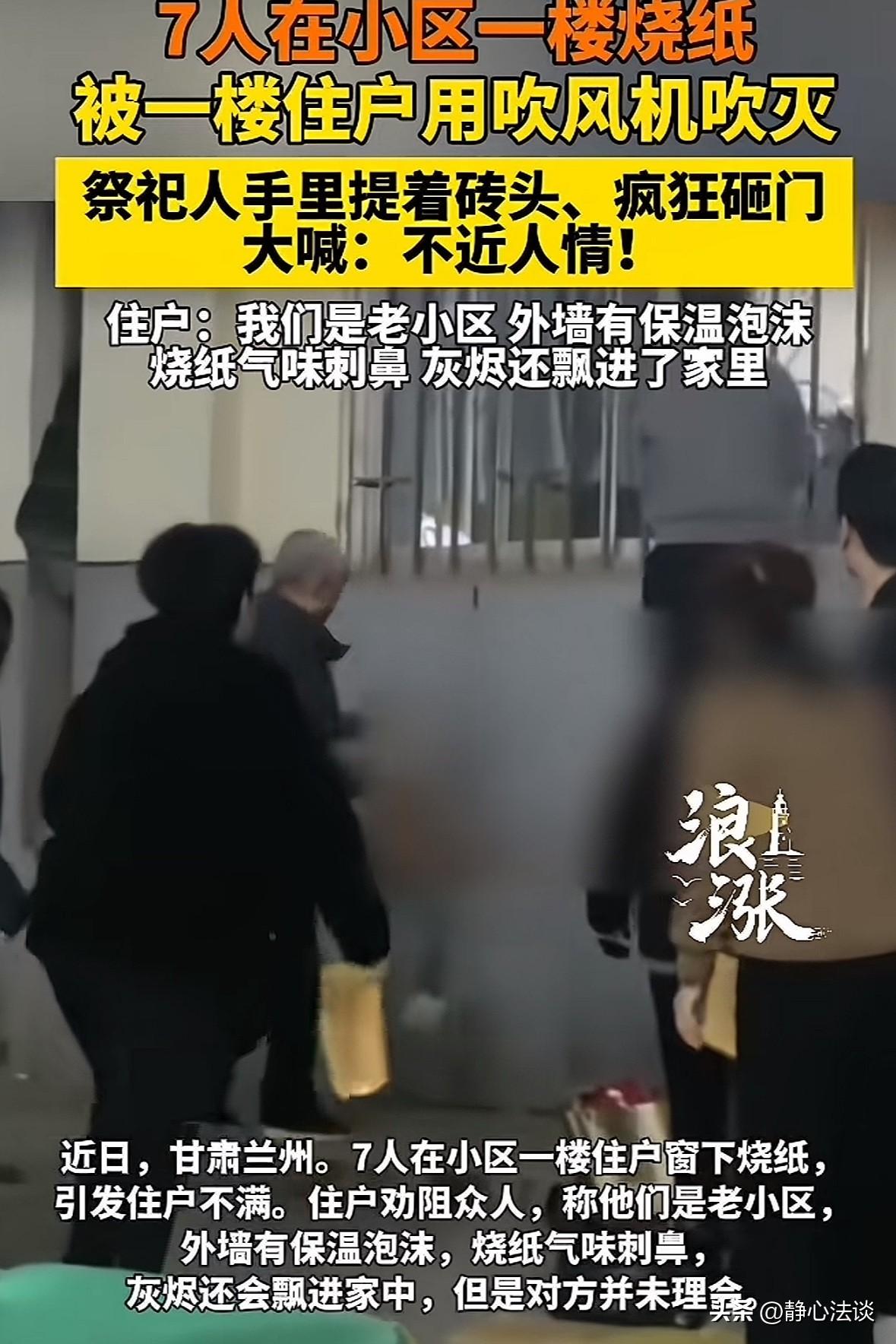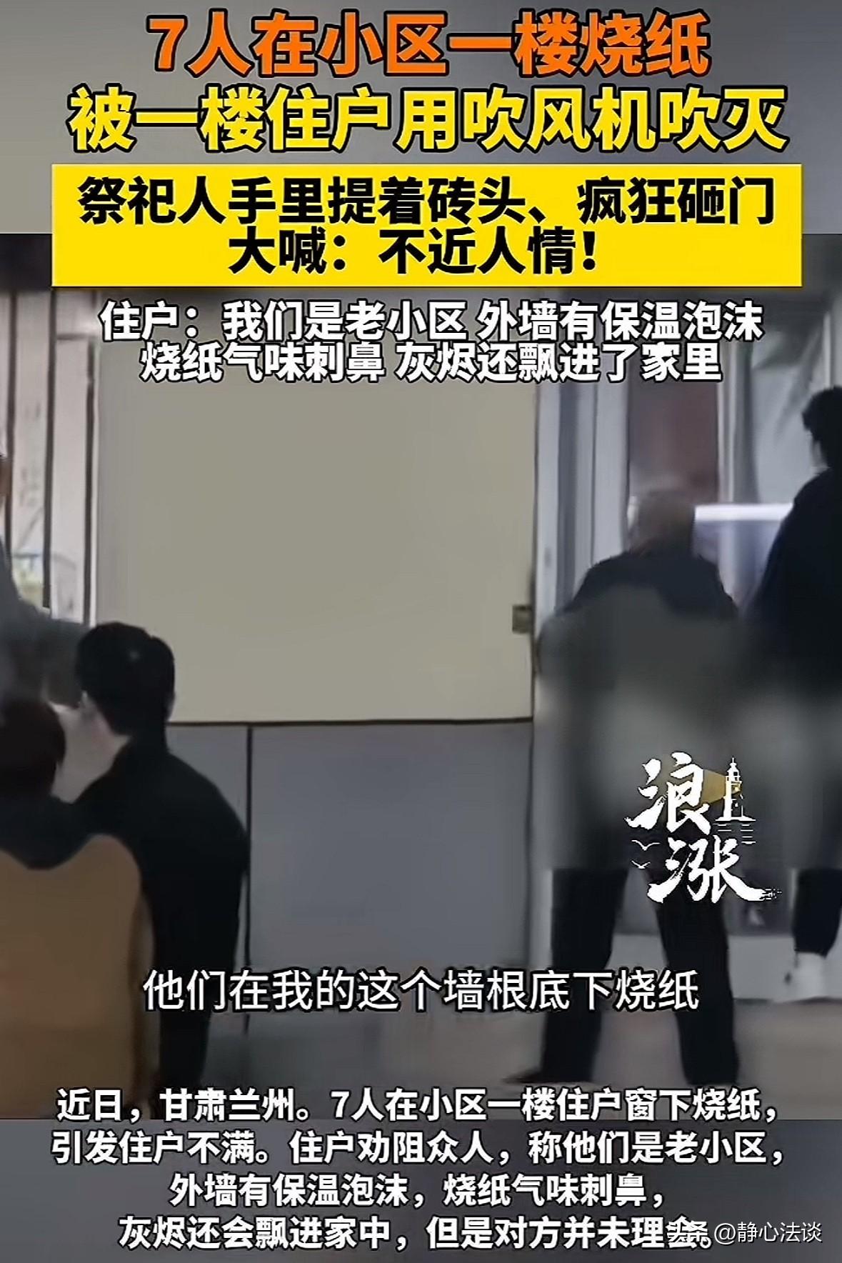 甘肃兰州,7个人在小区1楼窗户下面烧纸,灰烬和烟味飘1楼住户家里,于是提出劝阻,没想到几个人不管不顾,并未理会,1楼住户急了,这小区本来就老,外墙还有保温板,这要是着了后果不堪设想,于是用吹风机把纸吹灭,没想到烧纸的几人情绪失控,使劲拉一楼的护栏,拿着砖头还要砸门,大喊不近人情!网友:见过烧纸的,没见过在人家窗户底下烧的! 男子在家看电视,突然闻到一股窜鼻的烟味,他在屋里转了一圈也没发现有什么问题。 他做梦都没想到,自家窗户根下,竟然有7个人围在那烧纸,嘴里还嘀嘀咕咕的。 火苗窜起来,烟顺着风从窗户缝里飘,纸灰打着旋往上飞,粘在了窗户的防盗网上。 男子察觉到异样,起身前去查看,看到那个场景是又惊又气。 男子赶紧出面制止,他表示这老小区外墙大多有保温层,特别易燃。 何况你在哪烧你也不能跑人家窗户下面来烧啊,这不欺负人吗! 一楼住户男子好言劝阻,想着大家都是邻里,把道理说清楚,对方应该能理解。 可不管怎么说,这几个人就跟没听见一样,该烧还是烧,该添纸还是添纸,完全不把别人的顾虑放在眼里。 劝说没用,讲理没用,总不能眼睁睁看着他们的所作所为。 男子急了,直接拿出吹风机,对着火堆一顿吹,硬生生把火给吹灭了。 本来以为事情到此为止,大不了把现场收拾干净,互相退让一步也就过去。 可谁也没料到,对方的火气比烧纸的火苗还要旺。 火一灭,几个人瞬间炸了锅。他们觉得自己是在祭祀先人,是正经事,被人这样打断,就是不近人情,就是不懂规矩。 情绪上来之后,有人伸手拉扯住户的护栏,有人拎着砖头用力砸门,一副不肯善罢甘休的样子。 一边觉得逝者为大不能不敬,一边觉得安全第一不能胡来,两边都觉得自己占理,场面一度十分紧张。 不得不说,小区是公共区域,不是自家院子,哪能不能想干什么就干什么。 退一万步说,就算不考虑安全,你在人家窗根底下烧纸,烟飘进人家屋里,影响人家正常生活,这本身就是没素质的行为。 住户劝阻,是合情合理合法的,用吹风机灭火,是被逼无奈的自保。 缅怀先人,方式有很多,献束花鞠个躬,同样能表达心意,没必要非得在居民楼底下搞这出。 这根本就不是尽孝,分明是给先人丢脸,给自己惹祸。 真正的孝心,是心里装着先人,而不是摆给别人看的形式,是尊重先人的同时,也尊重身边的每一个人 后来这伙人最终还是把现场清理干净,也答应不再在这里焚烧祭祀,事情算是暂时平息。 其实邻里之间,本就该互相体谅,你顾及我的安全,我尊重你的习俗,凡事多退一步,多想一想别人,很多矛盾根本不会发生。 可总有人把自己的事放在第一位,把别人的感受和安全抛在脑后,最后小事闹大,好事变糟,实在不值得。 《消防法》第21条:禁止在具有火灾、爆炸危险的场所吸烟、使用明火。 老小区楼体有易燃保温层、楼道密集、人员多,属于具有火灾危险的场所。 在居民楼墙根烧纸,就是违规使用明火,本身就违法。 《治安管理处罚法》第26条:有下列行为之一的,处五日以上十日以下拘留,可以并处五百元以下罚款;情节较重的,处十日以上十五日以下拘留,可以并处一千元以下罚款: (一)结伙斗殴的。 (二)追逐、拦截他人的。 (三)强拿硬要或者任意损毁、占用公私财物的。 (四)其他寻衅滋事行为。 7人有错在先,事后还砸门,拿持砖无理取闹,完全符合寻衅滋事,如果住户追究,可以以任意损毁财物、扰乱小区秩序,可拘留5到15日及罚款。 对此,你怎们看这件事!