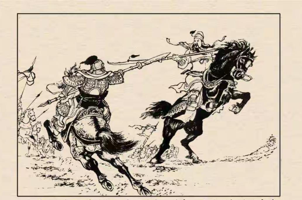 三国演义连环画:这员曹军大将是谁?竟然纵马挥刀直取关羽!看那关羽仓促举刀招架,连赤兔马也惊的抬起前蹄的画面,这员大将第一刀差点成功了