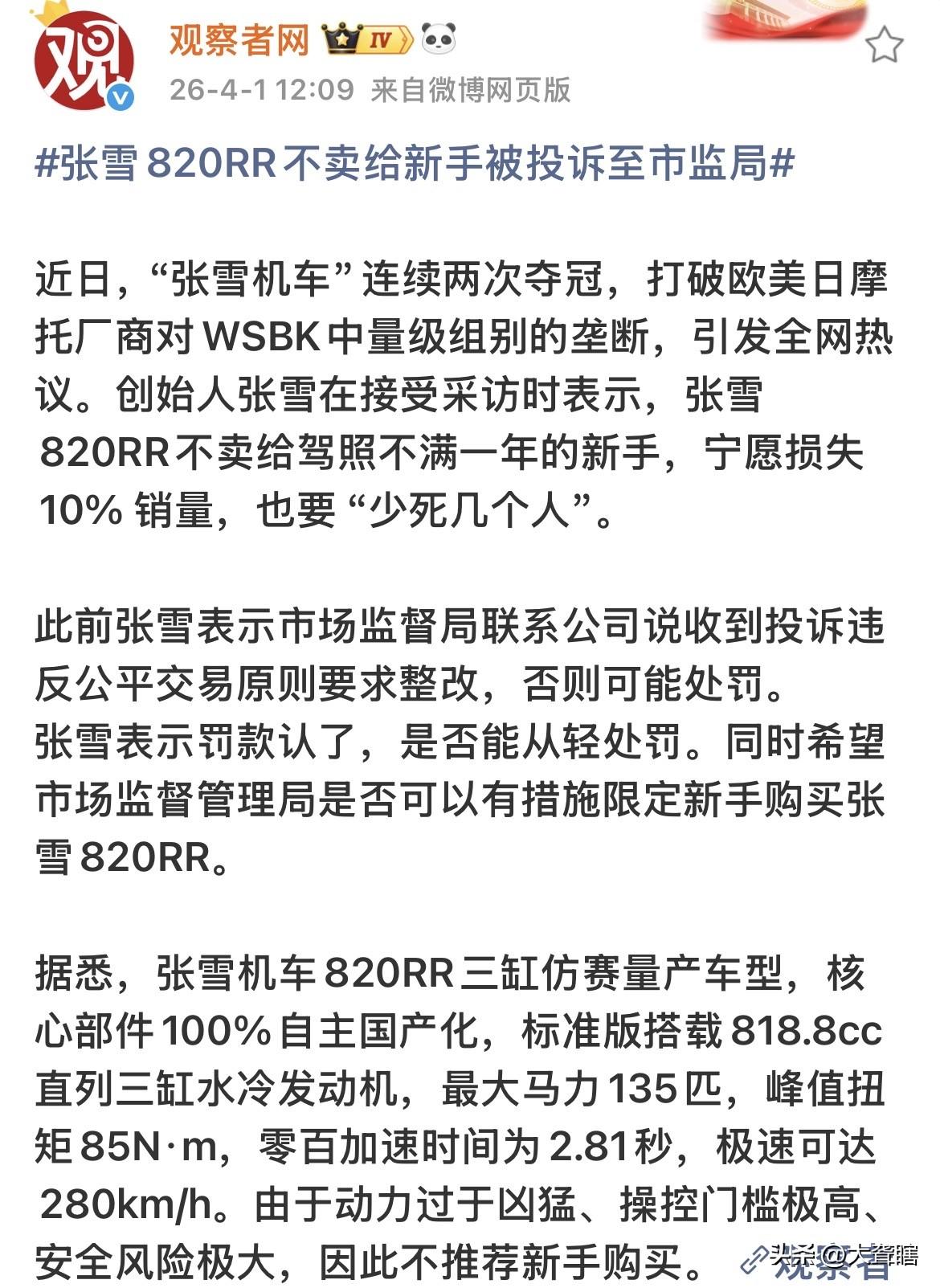 ‘’张雪机车‘’不卖车遭用户投诉! 由于担心用户安全问题,一款‘’张雪机车‘’820RR三缸仿赛量产车型不向驾龄不满一年的用户售卖,随后遭到用户向市监局投诉。 张雪对此表示,如果可以减少人员伤亡,那么公司宁愿销售量减少10%。 由此可见,‘’张雪机车‘’本着为用户的安全考虑而作出的决定。