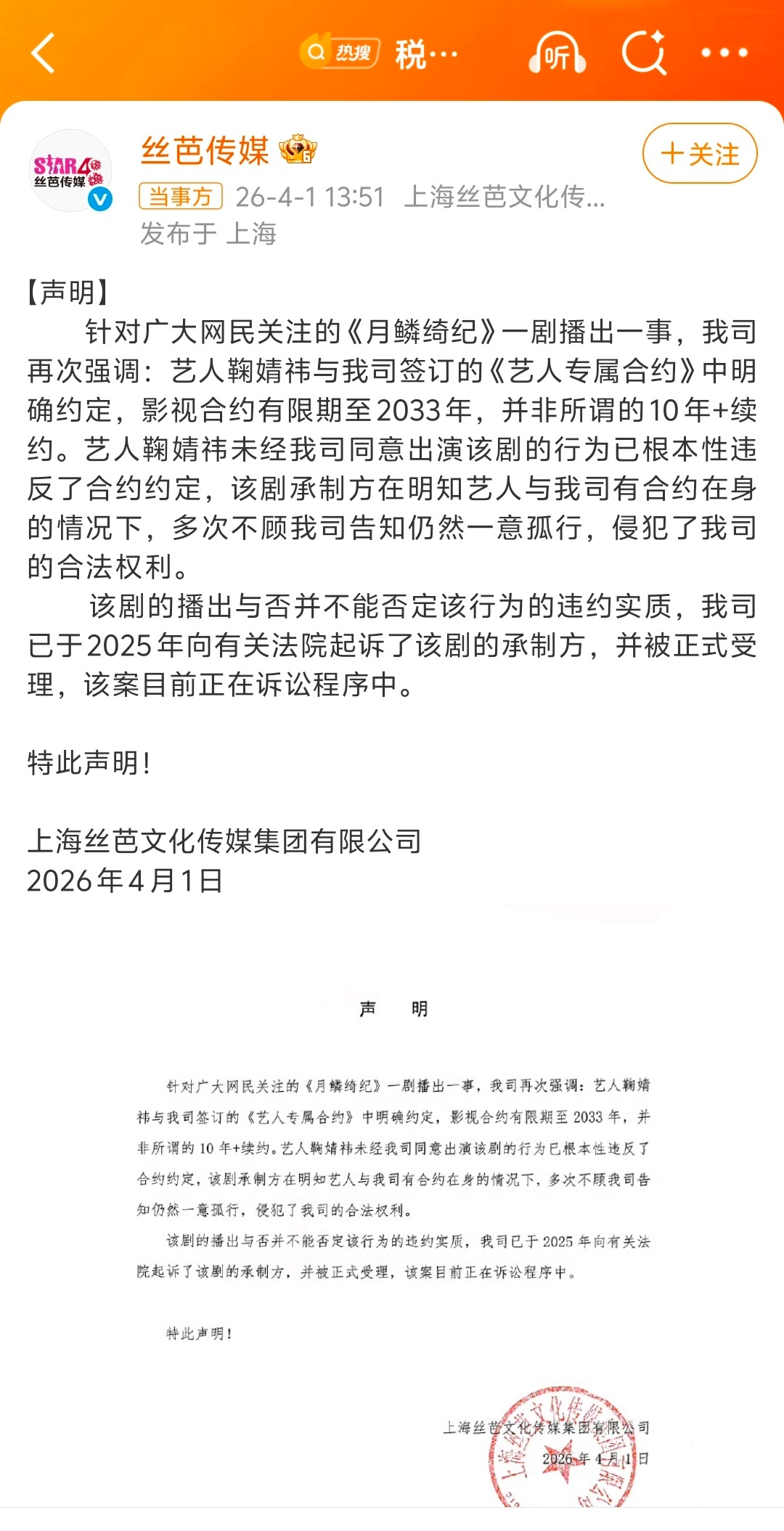 丝芭称鞠婧祎出演月鳞绮纪违约又是声明