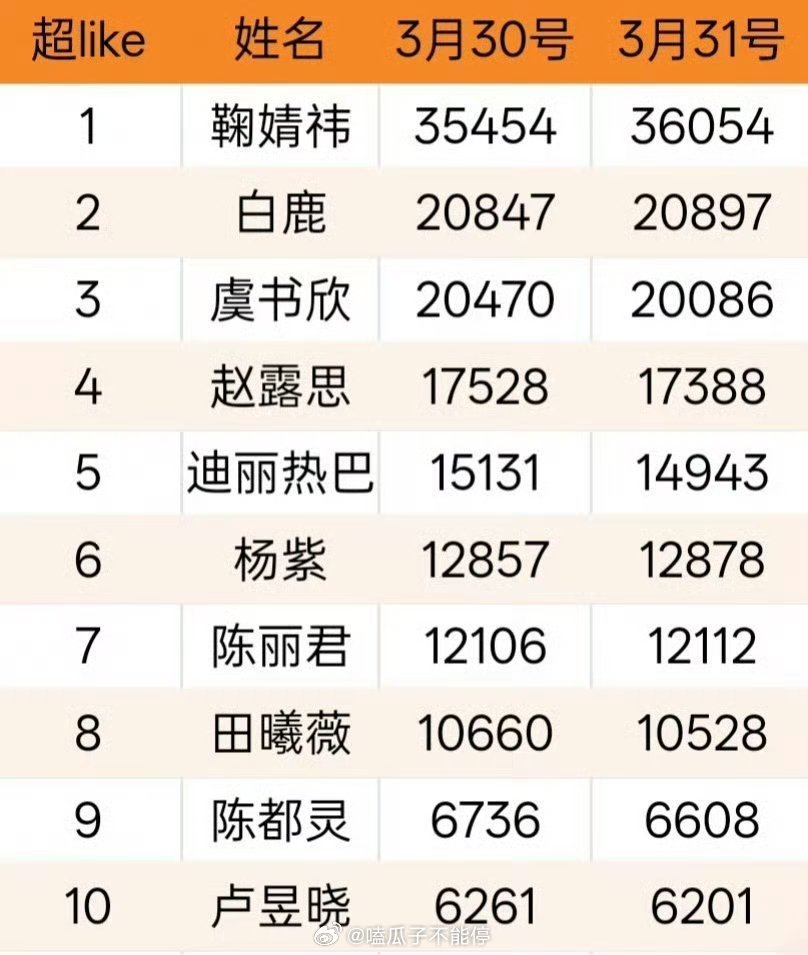 昨天女星超like前十名: