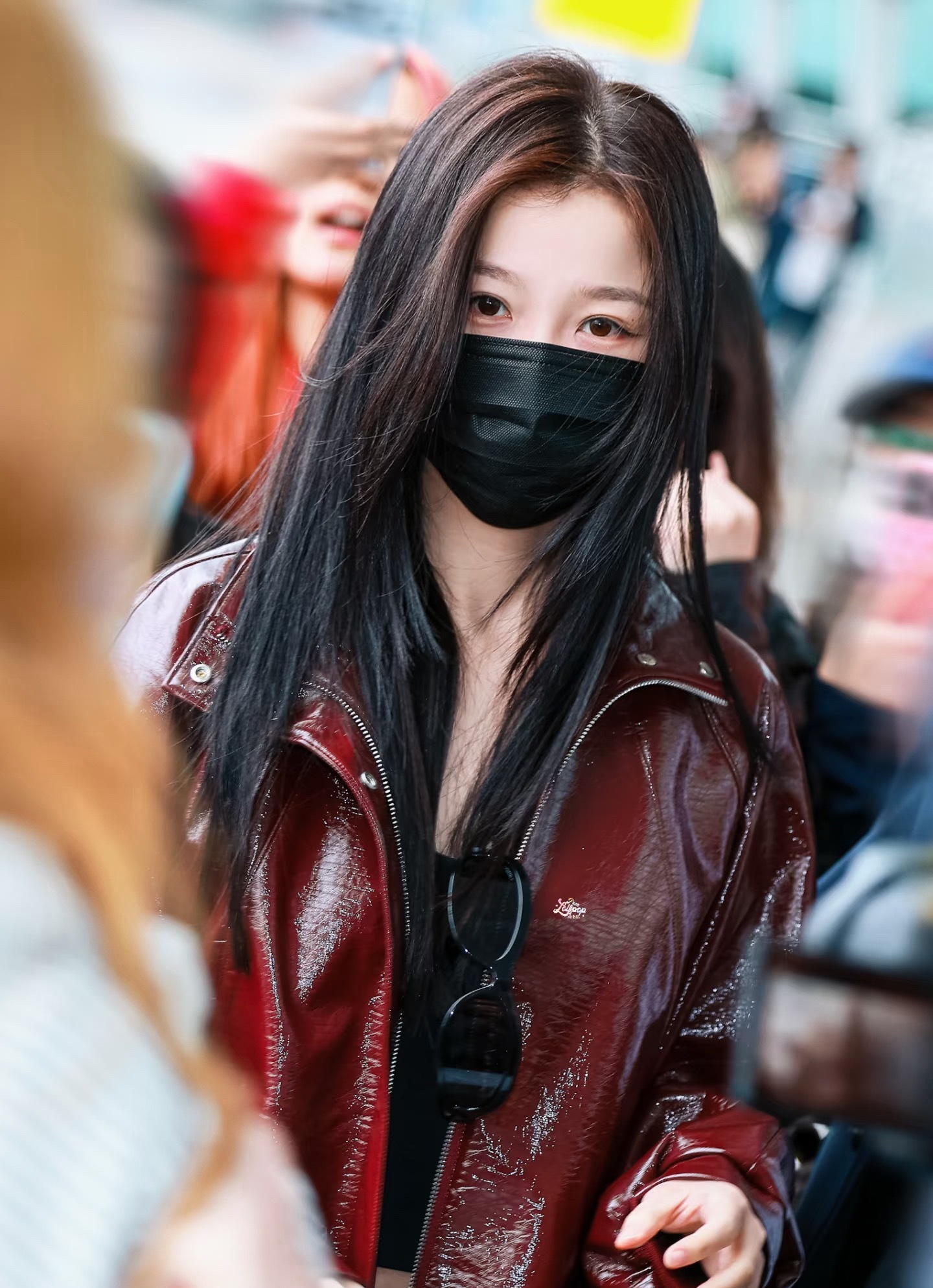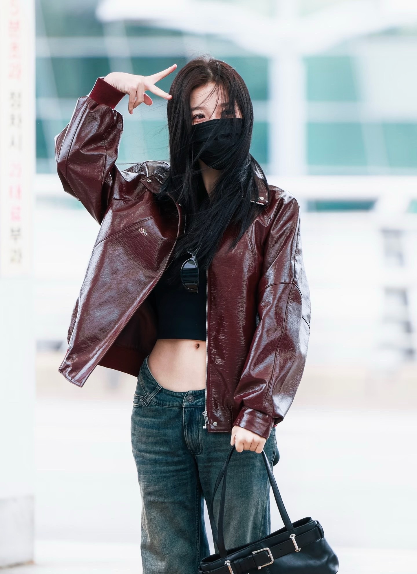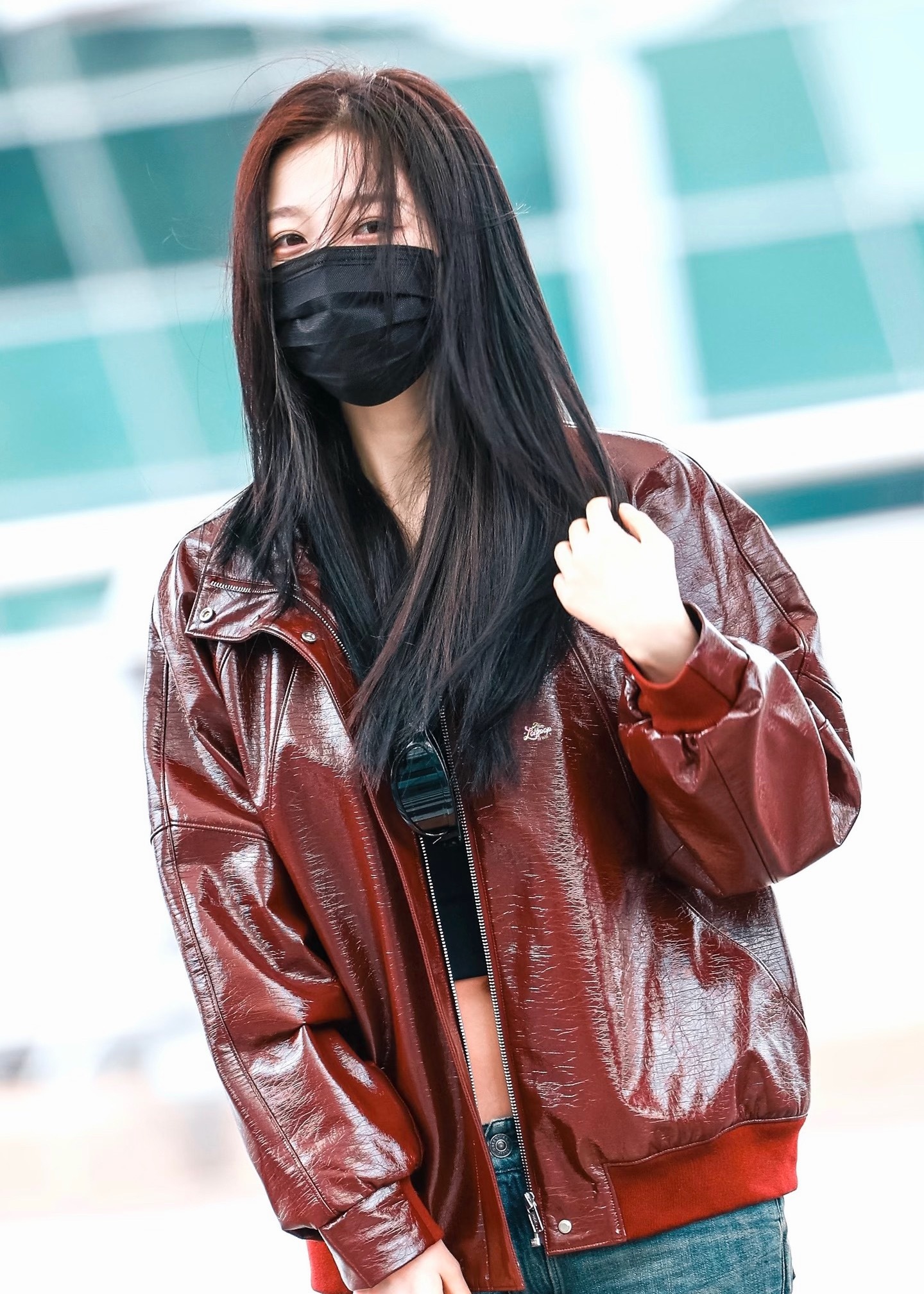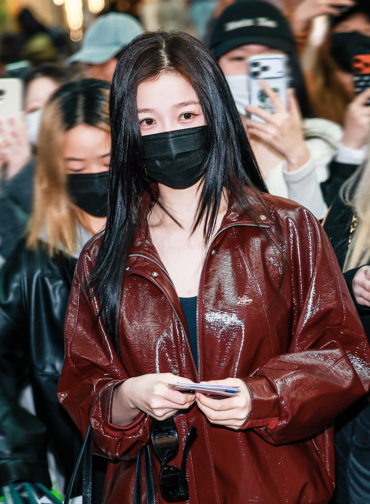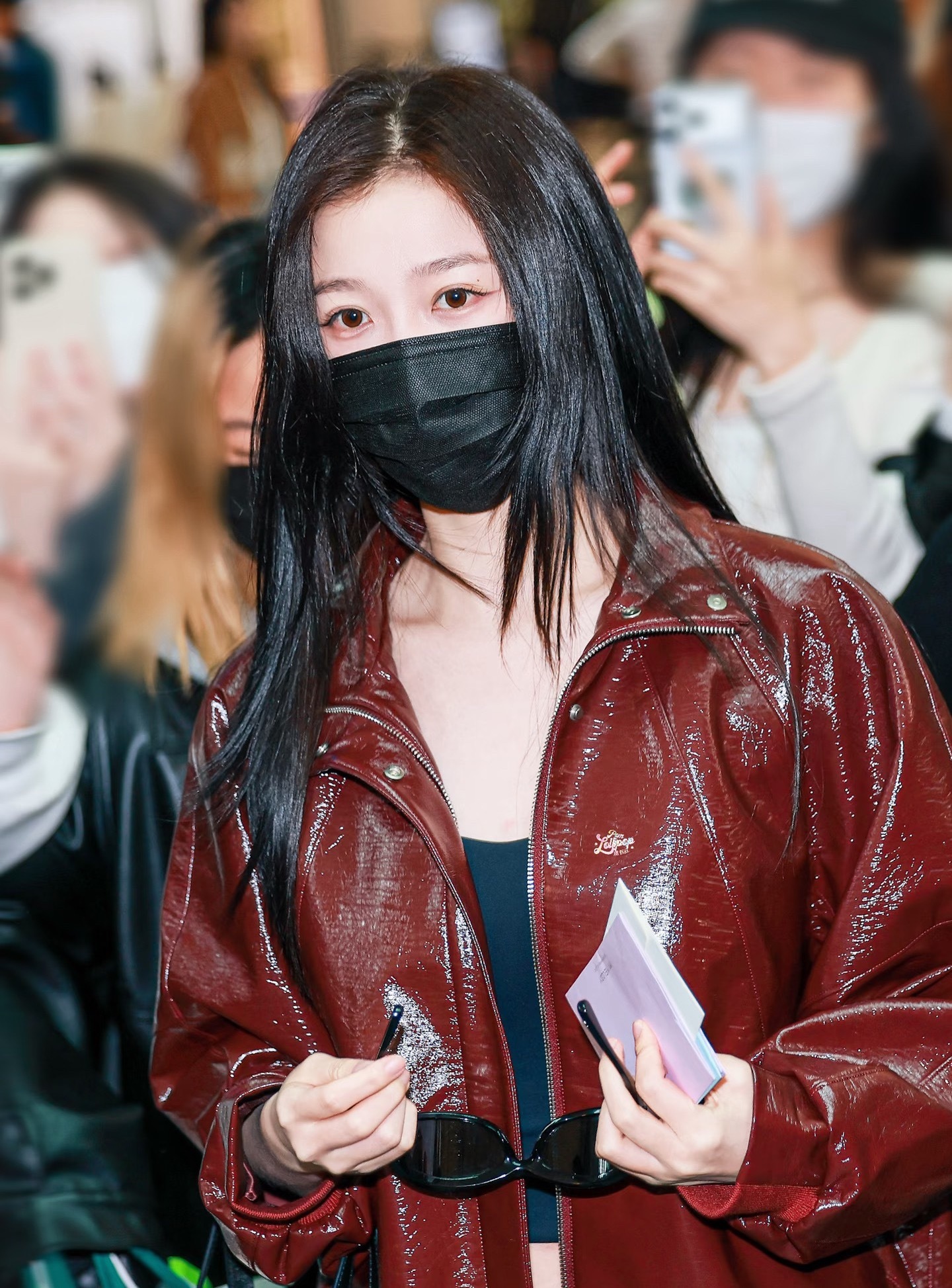 虞书欣韩国出发回国路透🈶,黑长直➕红皮衣姐感十足!